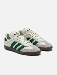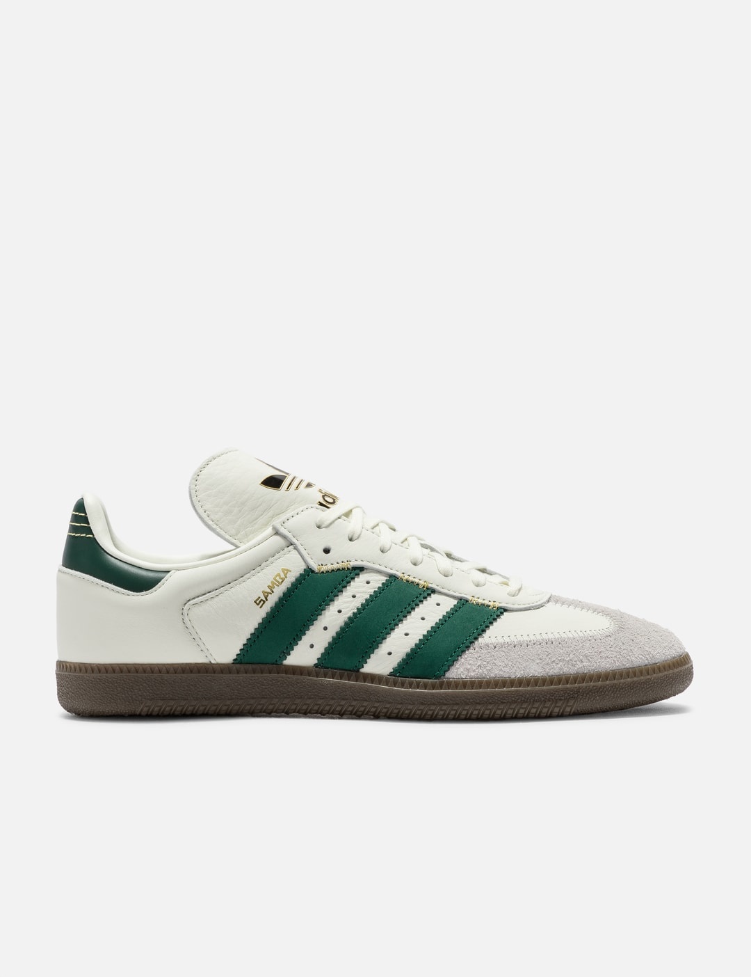 - Adidas Originals - Samba OG - Leather upper with T-shaped suede overlays - Lace-up front - Branded tongue - Round toe - Signature 3-stripe appliqué to the sidewalls - Gold-tone logo detailing - Flat rubber outsole - Color: Ivory/Collegiate Green/Gold Met - Style Code: IF1811 - Material: Leather, Suede, Rubber - See more Sneakers and Shoes