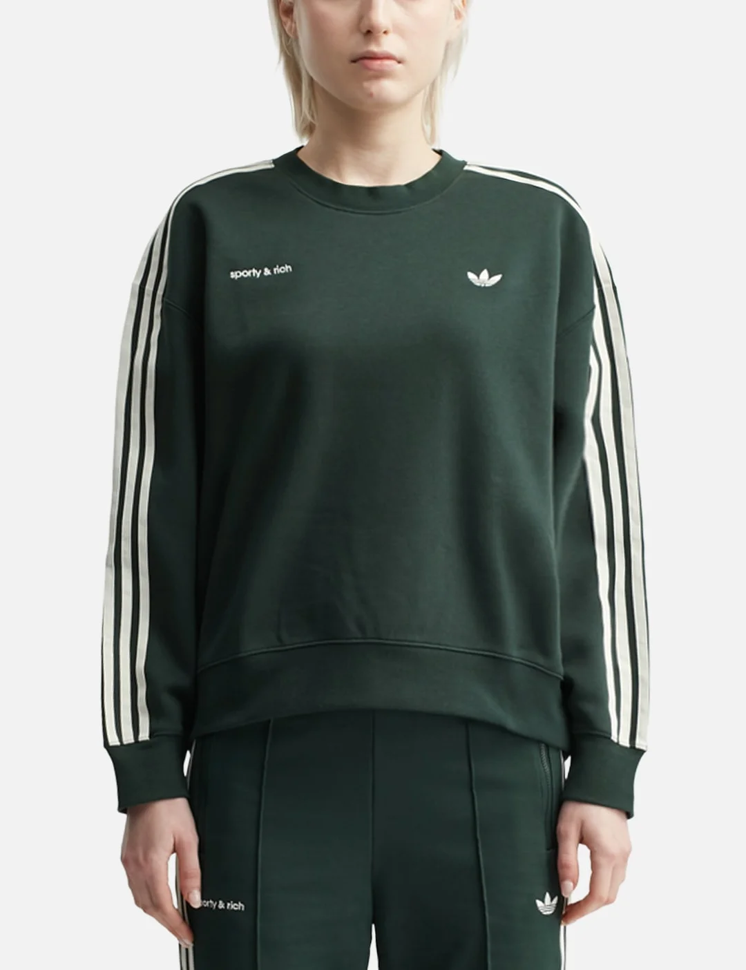 - Adidas Originals - Sporty & Rich Sweatshirt - adidas x Sporty & Rich collaborative collection - Soft cotton-blend fabric - Embroidered co-branding at front - Ribbed cuffs and hem - Brushed lining - Color: Shadow Green - Material: 52% Cotton, 48% Recycled Polyester - See more Sweatshirts and Clothing SIZING Male - Model wears size L - Model measures: Height 186cm, Chest 34”/86cm, Waist 28”/71cm, Hip 36”/91cm