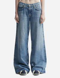 - AGOLDE - Clara Low Rise Baggy Flare Jeans - Relaxed wide leg with a subtle flare - Slightly stretchy cotton blend denim - Zip fly with button closure - Subtle fading and whiskering - Five-pocket design - Color: Signal - Material: 67% Organic Cotton, 22% Recycled Lyocell, 11% Recycled Cotton - See more Jeans and Clothing SIZING - Model wears size 26 - Model measures: Height 175cm, Chest 31”/79cm, Waist 24”/62cm, Hip 35’’/89cm
