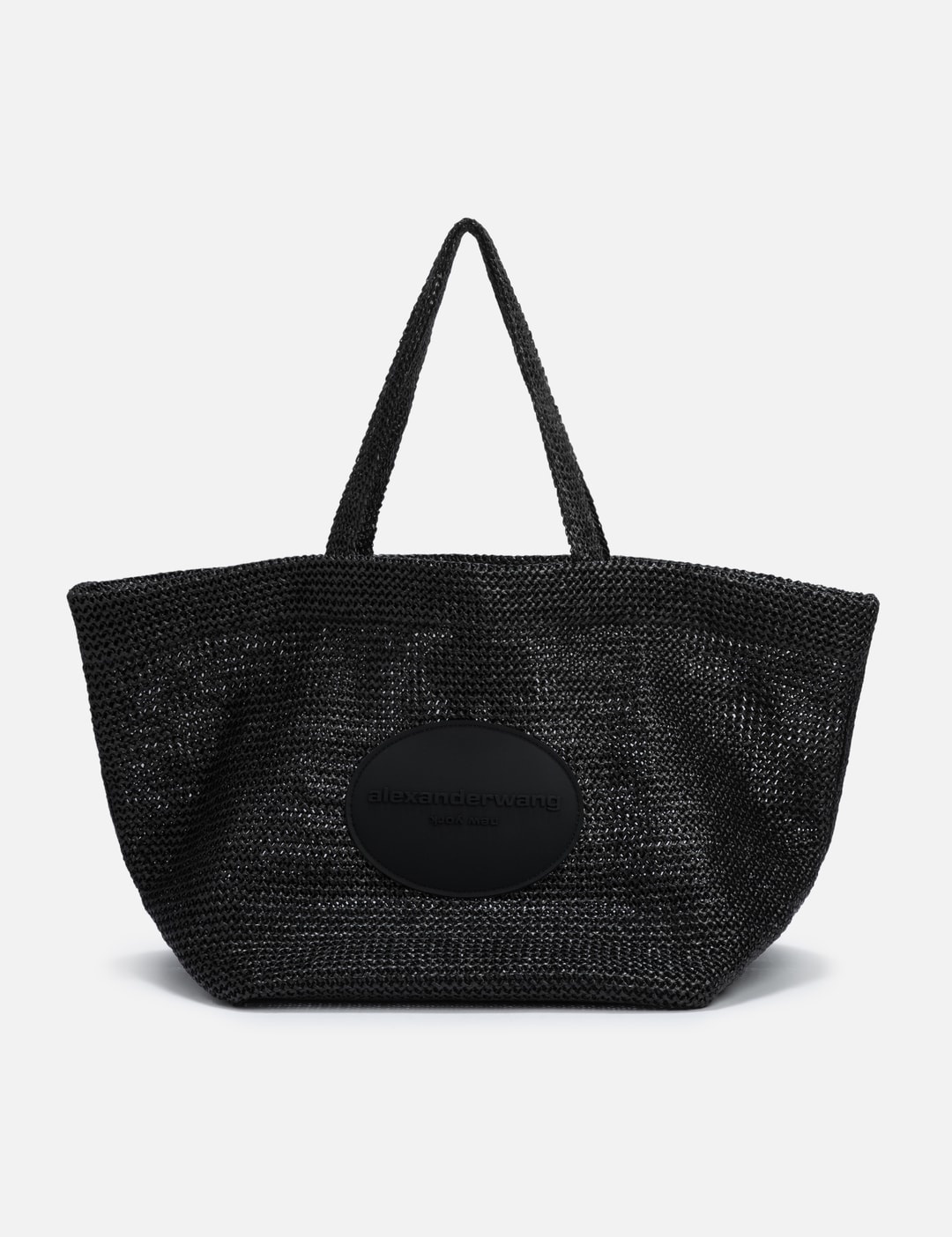 - Alexander Wang - XL Punch Tote Bag - Woven in synthetic raffia - Single tie closure - Main compartment with one interior slip pocket that fits a laptop - Raised tonal logo patch at front - Synthetic layering at inner base for stability - Color: Black - Material: 100% Polyurethane - See more Tote Bags, Bags and Accessories SIZING Approximate dimensions: - Height: 35cm - Width: 34cm - Depth: 32cm - Strap Length: 26cm