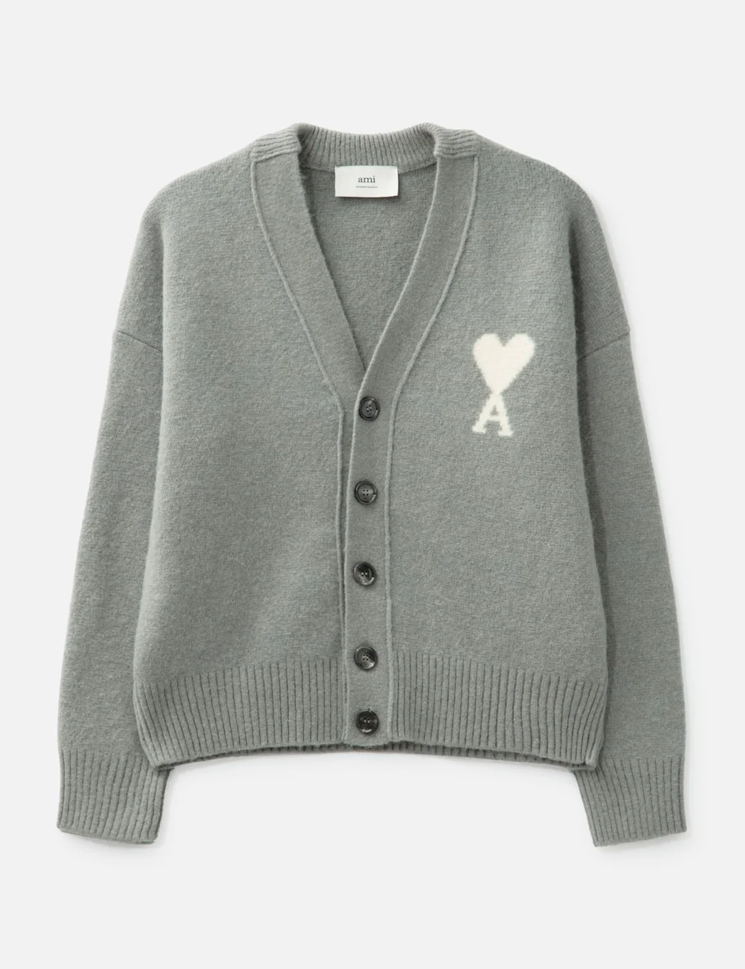 - Ami - Alpaca Ami De Coeur Cardigan - V-neck - Dropped shoulder - Button closure - "ami" engraved horn buttons - Intarsia knitted Ami de Coeur on the chest - Interlock stitch - Two front pockets - Inside out seams - Made in Portugal - Color: Grey/ Off White - Material: 50% Alpaca, 25% Wool, 23% Polyamide, 2% Elastane - See more Knitwear and Clothing - Model wears size M - Model measures: Height 188cm, Chest 37”/94cm, Waist 29”/73cm, Hip 38”/96cm - Model wears size S - Model measures: Height 177cm, Chest 30.5’’/77.5cm, Waist 25.5’’/65cm, Hip 35’’/89cm - Vendor Code: H25UKC365.KN0135