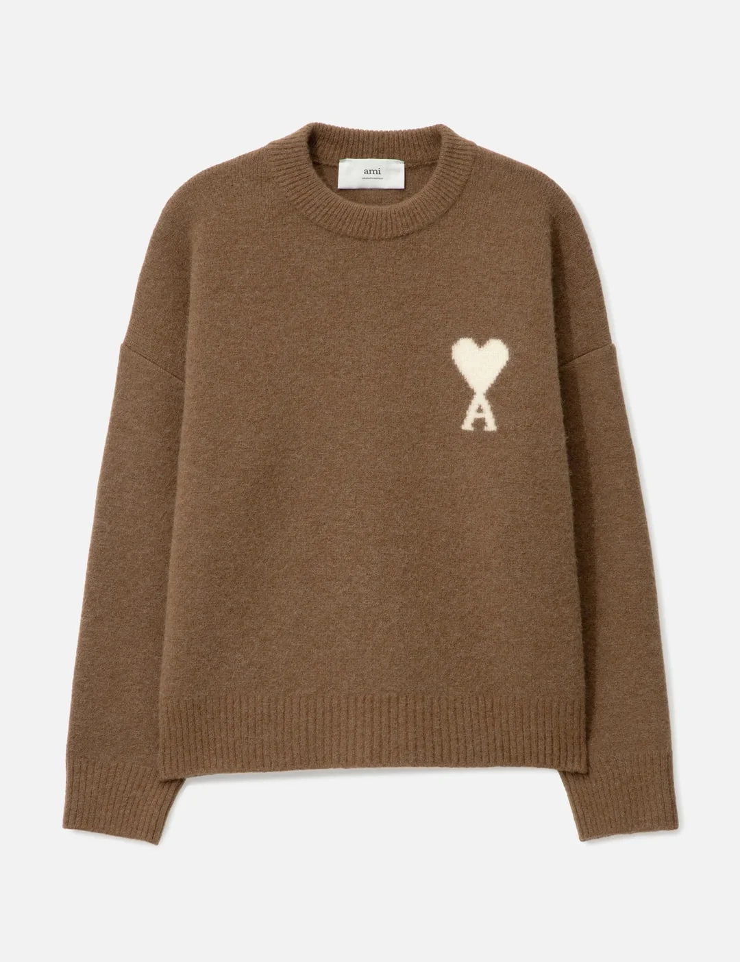 - Ami - Alpaca Ami De Coeur Crewneck Sweater - Made of alpaca-blend wool - Crewneck - Dropped shoulder - Ribbed neck, cuffs and hem - Knitted logo on the chest - Straight hem - Made in Portugal - Color: Hazelnut / Off White - Material: 50% Alpaca, 25% Wool, 23% Polyamide, 2% Elastane - See more Knitwear and Clothing - Model wears size L - Model measures: Height 190cm, Chest 32”/84cm, Waist 32”/81cm, Hip 34”/86cm Women - Model wearing size L - Model measures: Height 179cm, Chest 32’’/ 81.3cm, Waist 24.5”’/62cm, Hip 34.5’’/88cm - Vendor Code: H25UKS836.KN0135