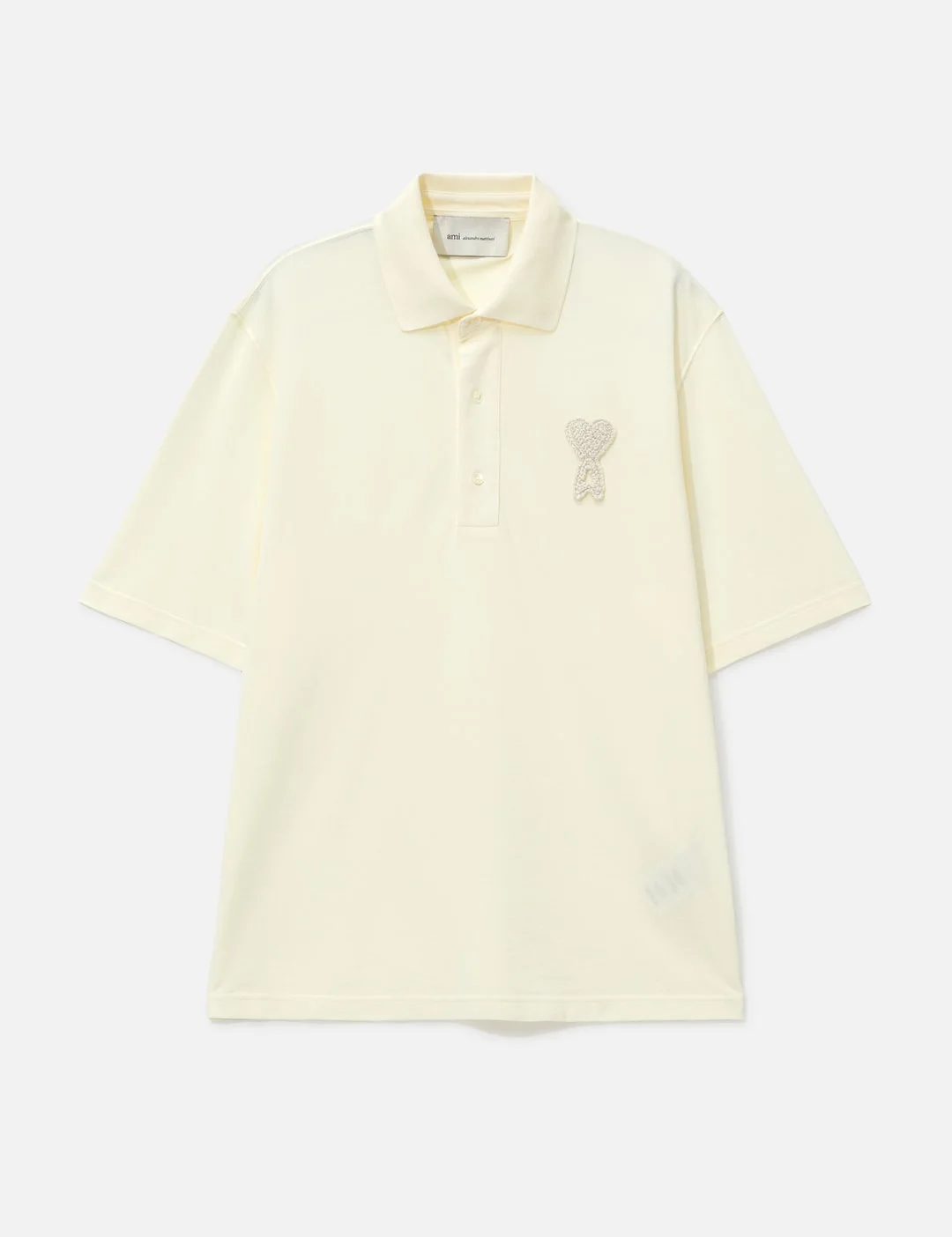 - Ami - Ami De Coeur Super Lightweight Cotton Pique Polo Shirt - Unisex - Made of lightweight cotton pique - Boxy fit - Shirt collar - Mother-of-pearl buttons on placket - Short sleeves - Tone on tone Ami de Coeur crochet patch - Tonal Ami embroidery on the back under neckline - Made in Portugal - Color: White Cream - Material: 100% Cotton - See more Polos and Clothing - Model wears size M - Model measures: Height 186cm, Chest 34”/86cm, Waist 28”/71cm, Hip 36”/91cm - Model wears size S - Model measures: Height 180cm, Chest 28.3’’/72cm, Waist 22’’/56cm, Hip 35’’/89cm - Vendor Code: UPL428.JE0221