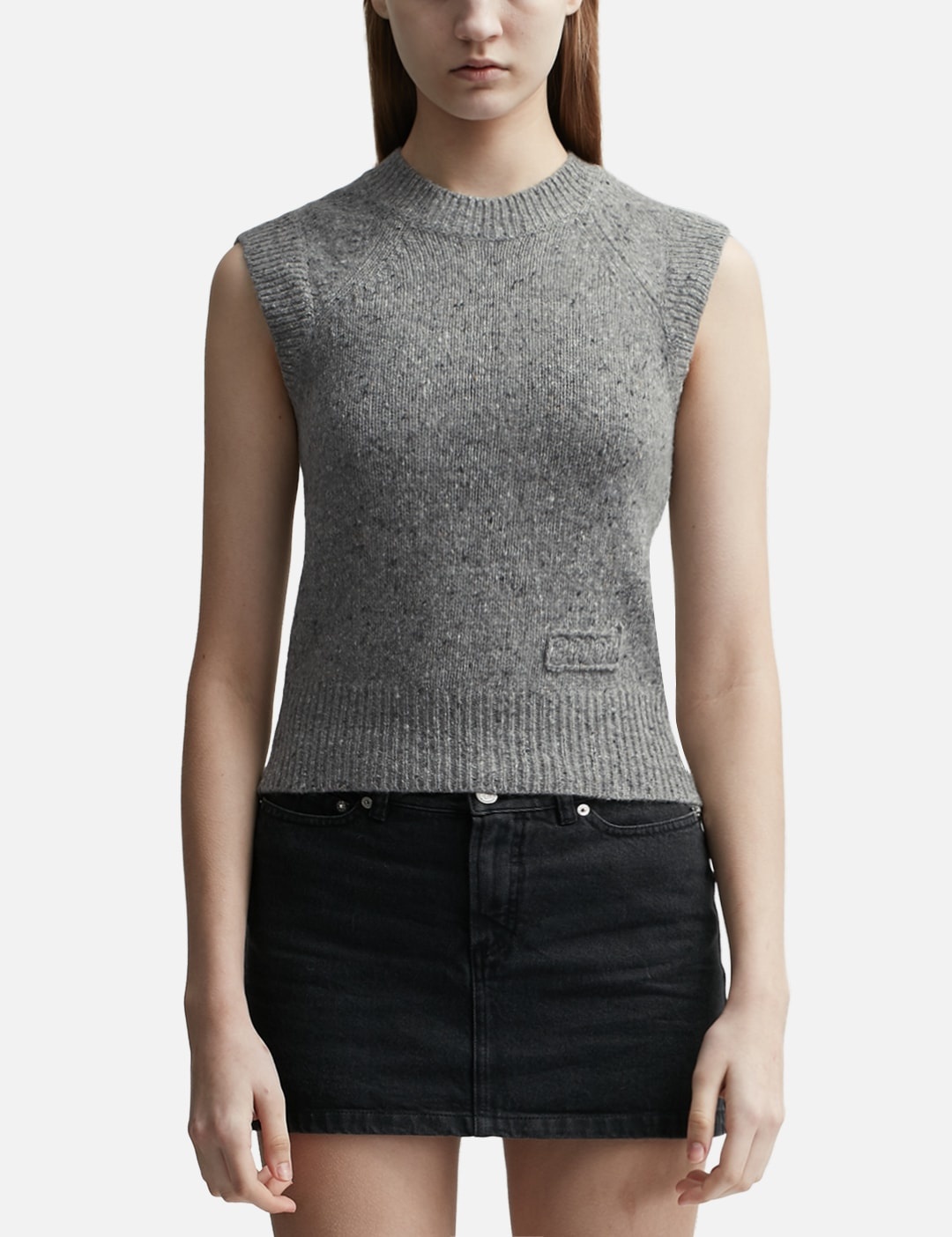 - Ami - Ami Embroidery Sleeveless Sweater - Sweater in wool donegal - Jersey stitch - Ribbed collar, trim and hem - Tonal ami embroidery at bottom - Made in Italy - Color: Light Heather Grey - Material: 80% New Wool, 20% Polyamide - See more Knitwear and Clothing SIZING - Model wears size S - Model measures: Height 178cm, Chest 33”/84cm, Waist 24’’/61cm, Hip 36’’/91cm