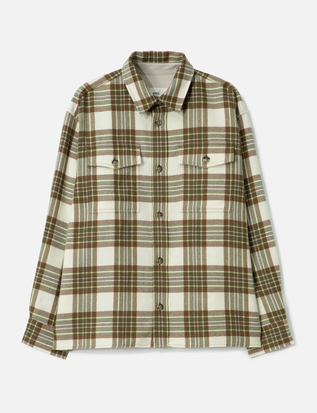 - Ami - Checked Wool Overshirt - Made of wool - Checkered pattern - Pointed collar - Button closure - Two front flap buttoned pockets - Long sleeves - Buttoned cuff - Embroidered brand logo at the back - Made in Portugal - Color: Hazelnut/Ivory/Anise - Material: 100% Virgin Wool; Lining: 50% Cotton, 50% Polyester - See more Shirts and Clothing - Model wears size M - Model measures: Height 188cm, Chest 37”/94cm, Waist 29”/73cm, Hip 38”/96cm - Vendor Code: H25USH771.WV0094
