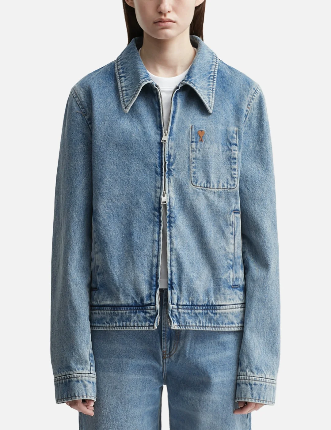 - Ami - Contrasted Ami de Coeur Zipped Jacket - Made of cotton - Pointed collar - Two-way zipper closure - Cuffs with denim metal buttons - Two front welt pockets - Ami de Coeur embroidery on the chest - Topstitching details - Ami "alexandre mattiussi" paper jacron patch on back hem - Made in Romania - Color: 480 Used Blue - Material: 100% Cotton - See more Denim Jackets, Jackets and Clothing - Model wears size M - Model measures: Height 186cm, Chest 34”/86cm, Waist 28”/71cm, Hip 36”/91cm - Model wears size S - Model measures: Height 180cm, Chest 28.3’’/72cm, Waist 22’’/56cm, Hip 35’’/89cm - Vendor Code: HJK835.DE0046