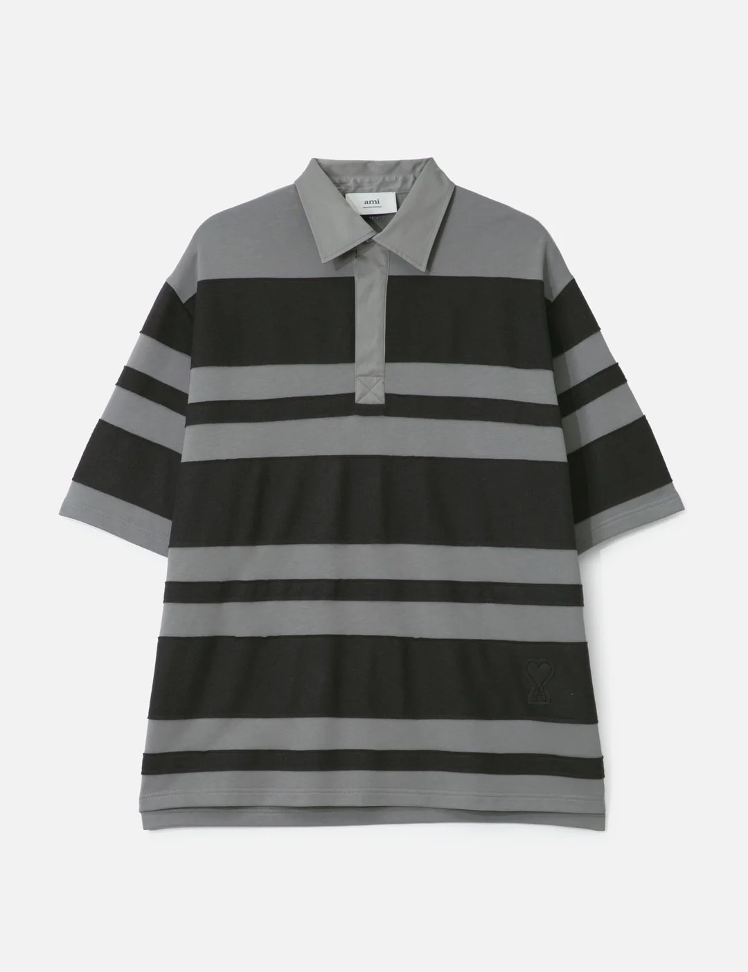 - Ami - Grey Cotton Ami De Coeur Stiped Polo - Made of cotton - Oversized fit - Classic collar in tonal cotton twill with fleece - Half button closure - Mother of pearl buttons - Short sleeves - Striped patchwork - Embossed Ami de Coeur logo stitch on hem - "Ami" logo embroidery on the back - Made in Portugal - Color: Grey/Anthracite - Material: First Fabric: 100% Cotton; Second Fabric: 100% Merino Wool; Third Fabric: 100% Cotton - See more Polos and Clothing - Model wears size M - Model measures: Height 188cm, Chest 37”/94cm, Waist 29”/73cm, Hip 38”/96cm - Vendor Code: H25UPL414.JE0168
