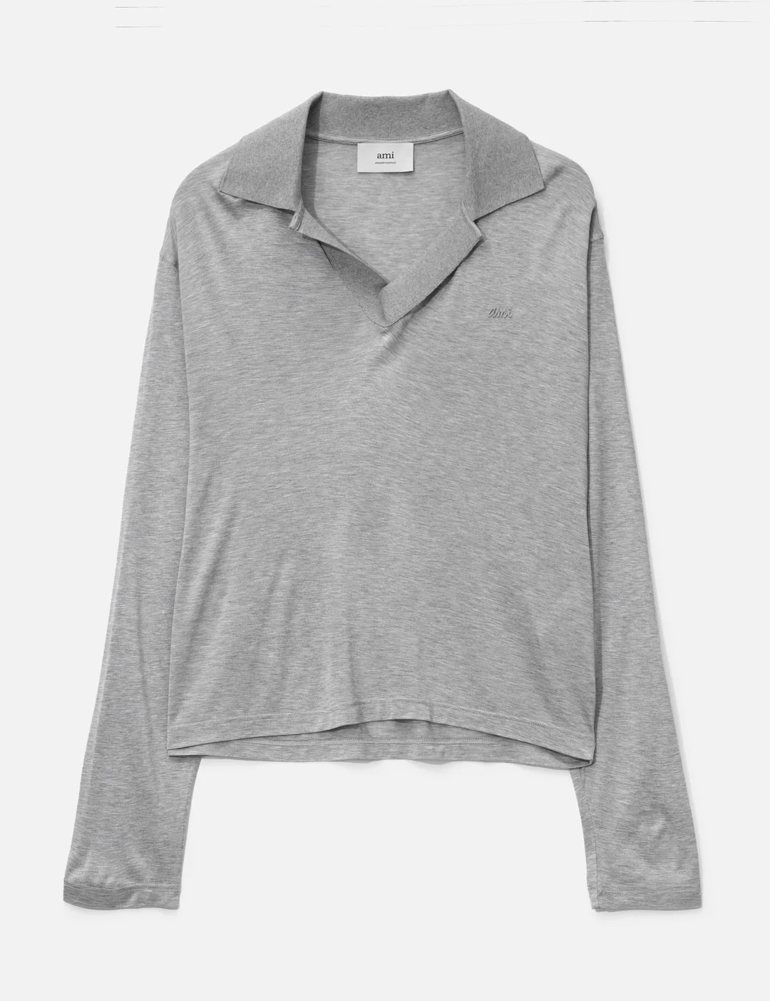 - Ami - Long Sleeve Polo Shirt - Loose fit - Open collar - Buttonless - Long sleeves - Brand embroidery on left chest - Asymmetrical hem - Tonal brand embroidery under the back neckline - Color: Grey - Material: 88% Viscose, 12% Silk - See more Polos and Clothing - Model wears size M - Model measures: Height 186cm, Chest 34”/86cm, Waist 28”/71cm, Hip 36”/91cm - Vendor Code: H25HPL401.JE0124
