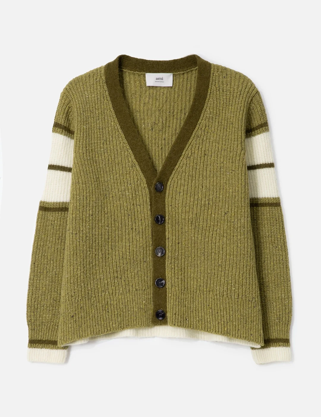 - Ami - Wool College Cardigan - Made of wool - V-neck - Horn button closure with engraved brand logo - Half english ribs stitch - Textured yarn on sleeves, cuffs and hem - Embroidered Ami de Coeur patch at the back - Made in Portugal - Color: Green Lichen - Material: 92% Wool, 5% Alpaca, 2% Polyamide, 1% Elastane - See more Knitwear and Clothing - Model wears size M - Model measures: Height 188cm, Chest 37”/94cm, Waist 29”/73cm, Hip 38”/96cm - Vendor Code: H25HKC358.KN0111
