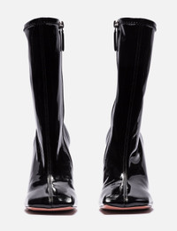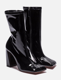 - Amina Muaddi - Marine Stretch Bootie - Ankle height - Stretch fit - Latex upper - Squared oblique toe design - Lambskin and goatskin lining - Zip closure - 95mm block heel - Leather outsole - Rubber heel cap - Fits true to size - Made in Italy - Color: Black Latex - Material: Upper: 40% Polyester, 14% Cotton, 46% Polyamid ; Lining: 79% Lambskin And 21% Goatskin ; Sole: 70% Leathe, 30% Rubber - See more Boots and Shoes