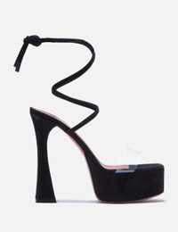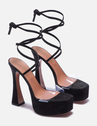 - Amina Muaddi - Sita Platform Sandals - Suede upper with a transparent PVC strap - Suede wrap around ankle strap - Square toe - Leather insole - Color: Black Suede - Material: Suede - See more Heels and Shoes