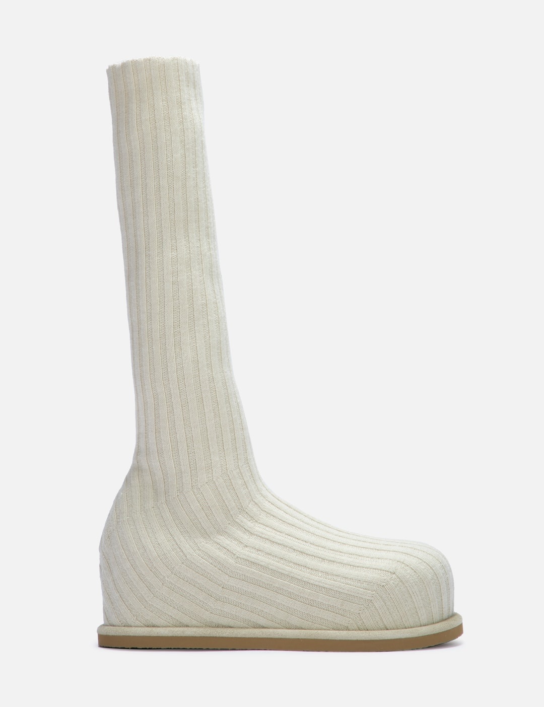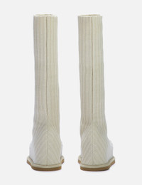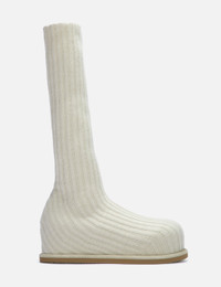 - Amina Muaddi - Veneda Stretch Boot Flatform - Flat knitted sock-effect - Wool mixed knit - Rounded toe - Below the knee - Leather lining - 15mm platform - Rubber outsole - Fits true to size - Made in Italy - Color: Taupe Fuzzy - Material: Upper: 90% Wool, 10% Elasthanne ; Lining: 76% Sheepskin, 16% Lambskin, 8% Goatskin; Sole: 100% Rubber - See more Boots and Shoes