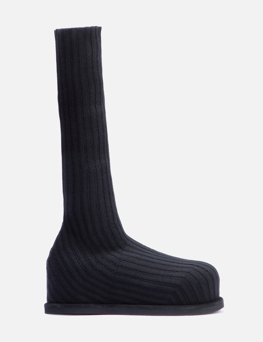 - Amina Muaddi - Veneda Stretch Boot Flatform - Flat knitted sock-effect - Wool mixed knit - Rounded toe - Below the knee - Leather lining - 15mm platform - Rubber outsole - Fits true to size - Made in Italy - Color: Black - Material: Upper: 90% Wool, 10% Elasthanne ; Lining: 76% Sheepskin, 16% Lambskin, 8% Goatskin; Sole: 100% Rubber - See more Boots and Shoes