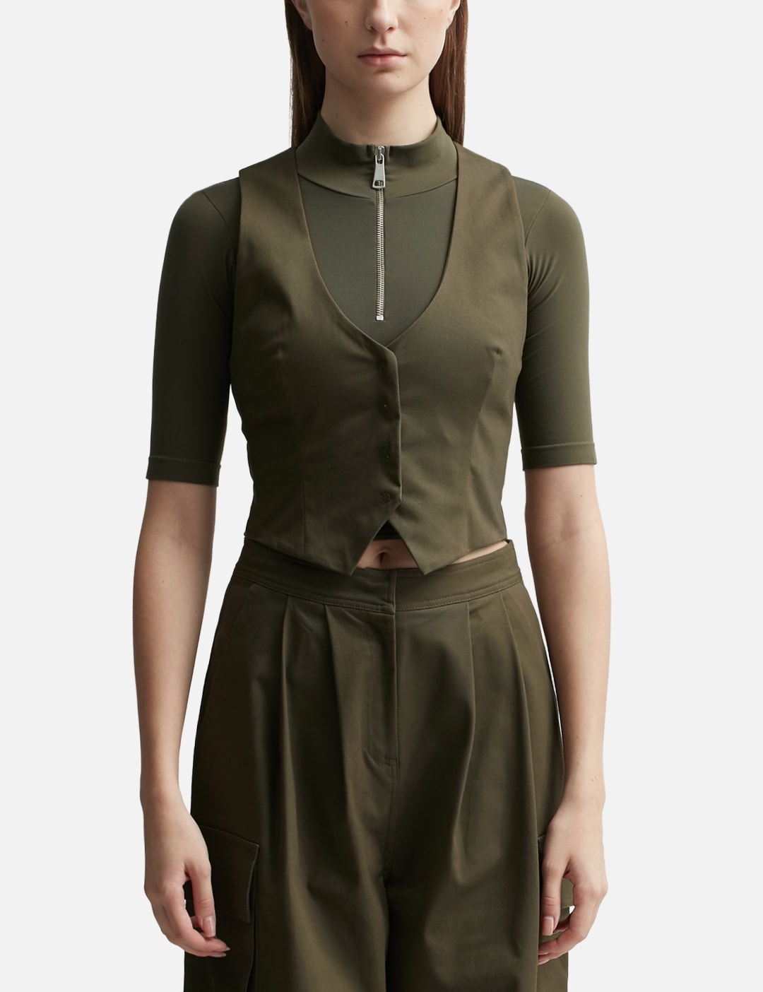 - ANDREĀDAMO - Gilet With Straps Details - Dart details - Front snap button closure - Cut-out details on the back - Color: Amazonia - Material: 98% Cotton, 2% Elastane - See more Vests and Clothing SIZING - Model wears size S - Model measures: Height 181cm, Chest 33”/84cm, Waist 24”/61cm, Hip 35”/90cm