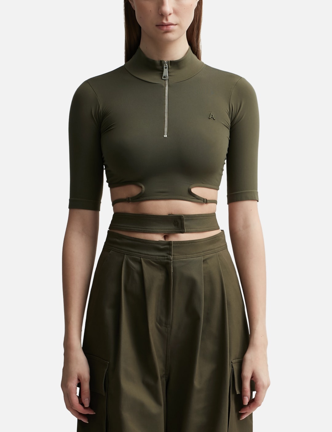 - ANDREĀDAMO - Sculpting Jersey Cut-out Top - Stretchy polyamide blended fabric - Cut-out detailing - Logo patch at the chest - Round neck - Front zip closure - Half-length sleeves - Cropped - Elastic waist strap - Color: Amazonia - Material: 72% Polyamide , 28% Elastane - See more Tops and Clothing SIZING - Model wears size S/M - Model measures: Height 181cm, Chest 33”/84cm, Waist 24”/61cm, Hip 35”/90cm
