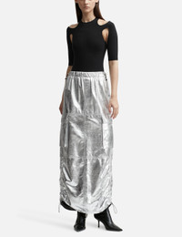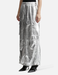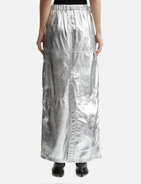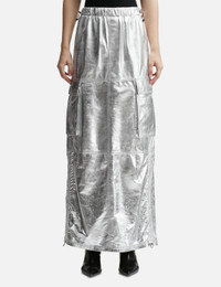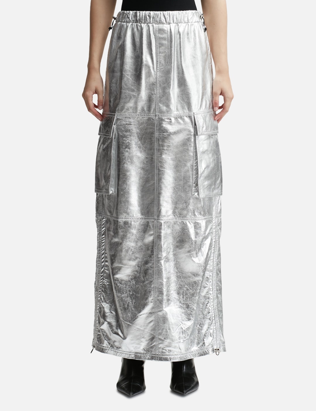 - ANDREĀDAMO - Wet Leather Maxi Skirt - Maxi-length - Painted leather outer - Reflective surface - Elasticated waist with drawcord adjustment - Back slit - Two flap pockets - Straight hem - Color: Wet Chrome - Material: 100% Lambskin - See more Skirts and Clothing SIZING - Model wears size S - Model measures: Height 179cm, Chest 33”/83cm, Waist 24.8”/63cm, Hip 35’’/89cm