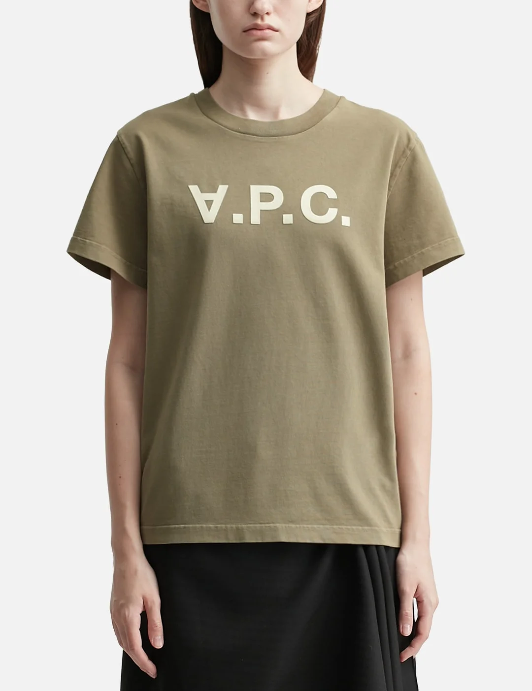 - A.P.C. - Standard Grand VPC T-shirt - Unisex - Made of GOTS-certified cotton - Straight cut - Crewneck - Short sleeve - Velvet-feel V.P.C. logo on front - Color: Khaki / Off-white - Material: 100% Cotton - See more SS T-Shirts, T-Shirts and Clothing - Model wears size M - Model measures: Height 186cm, Chest 34”/86cm, Waist 28”/71cm, Hip 36”/91cm - Vendor Code: COHMB-M26384