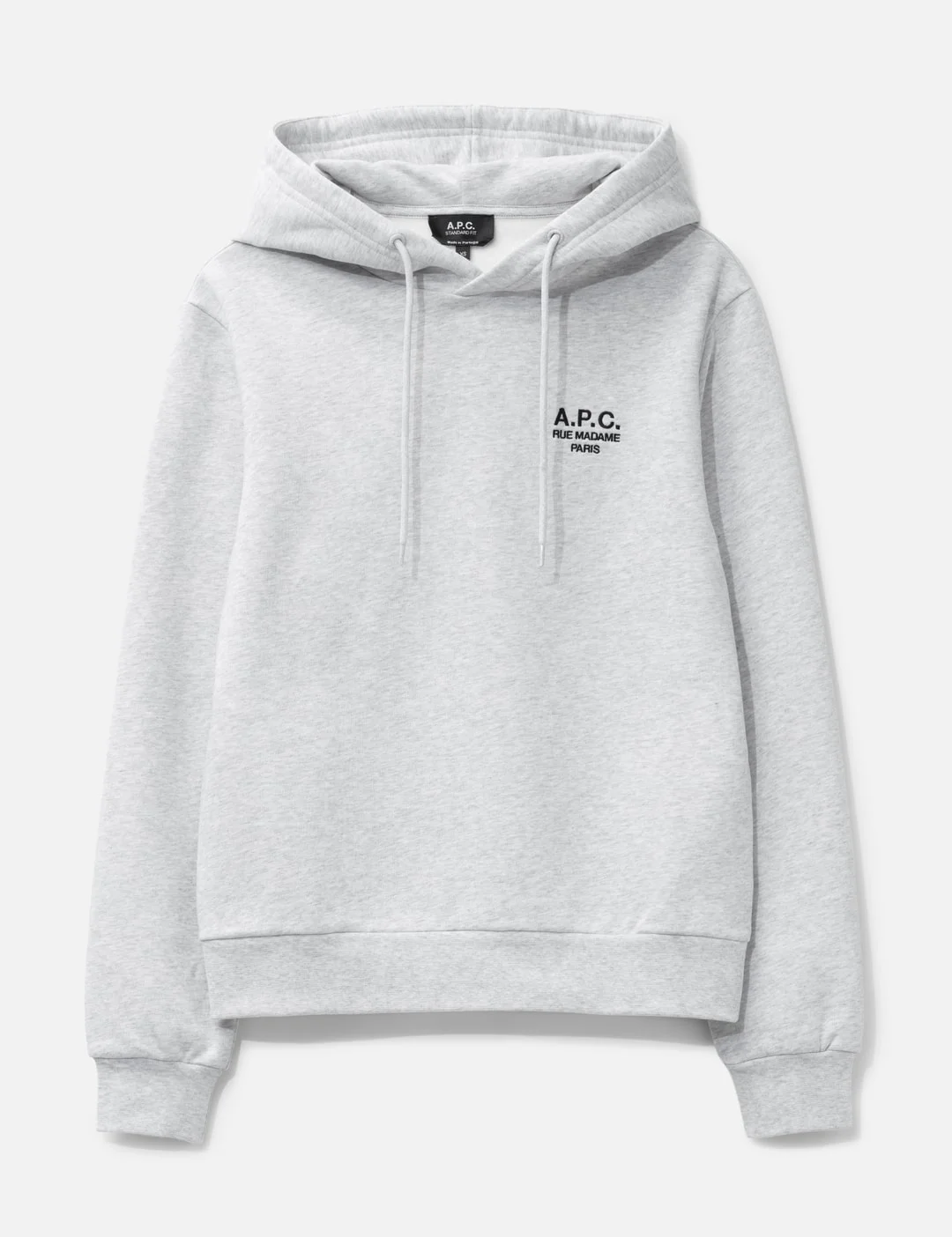 - A.P.C. - Standard Rue Madame Hoodie - Unisex - Made of GOTS-certified organic cotton - Straight cut - Hood with a drawstring - 'A.P.C. Rue Madame Paris' embroidery over the heart - Tone-on-tone drawstrings - Ribbed collar and hem - Brushed lining - Made in Portugal - Color: TPN Heathered Grey/ Black - Material: 99% Cotton, 1% Elastane - See more Hoodies and Clothing - Model wears size XL - Model measures: Height 186cm, Chest 34”/86cm, Waist 28”/71cm, Hip 36”/91cm - Vendor Code: COHBV-M27914
