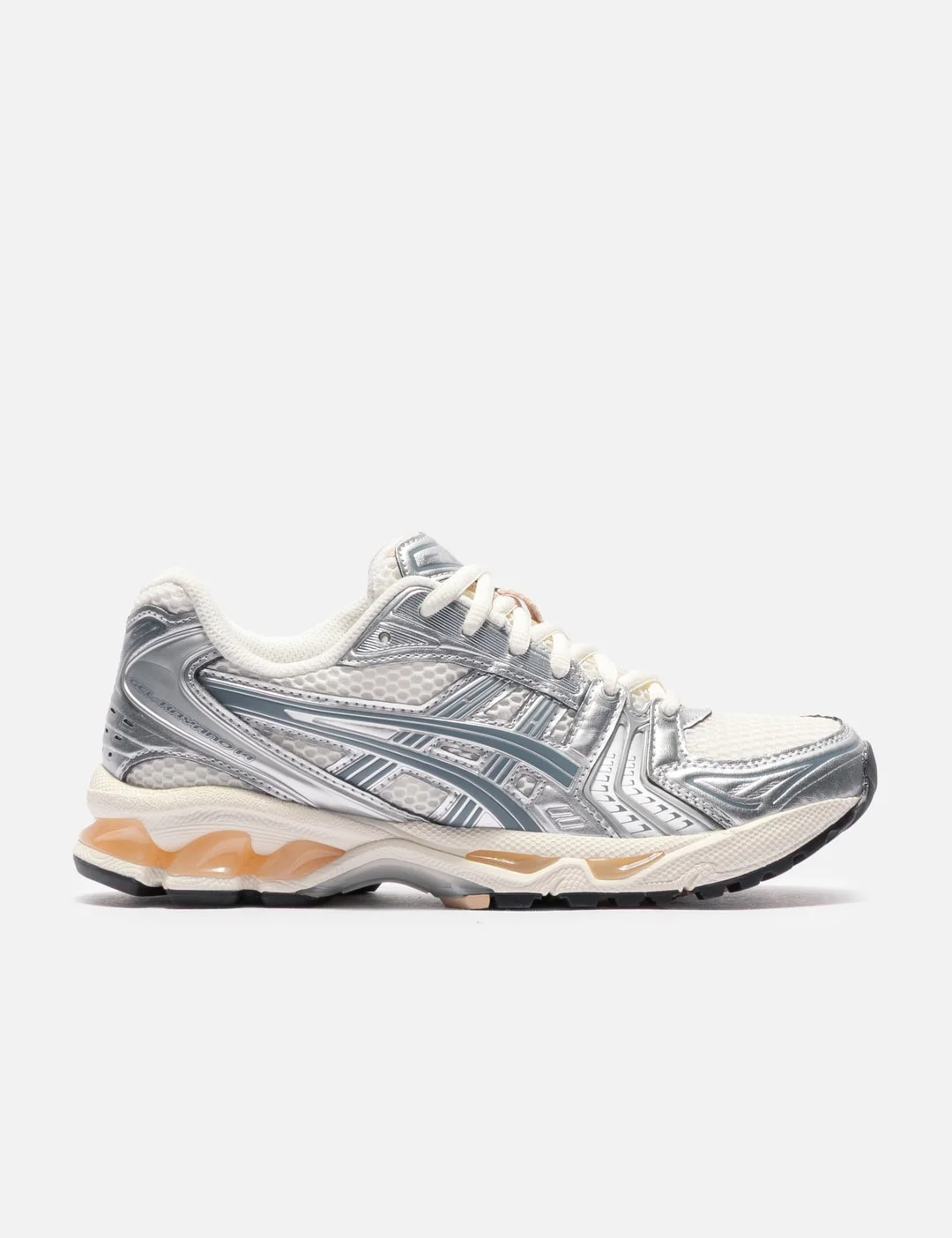 - Asics - GEL-Kayano 14 - Mesh, leather, and synthetic upper - Lace-up closure - GEL technology cushioning - Trusstic System - Rubber outsole - Color: Cream/ Ironclad - Material: Mesh, Synthetic, Rubber - See more Sneakers and Shoes - Vendor Code: 1203A537-109