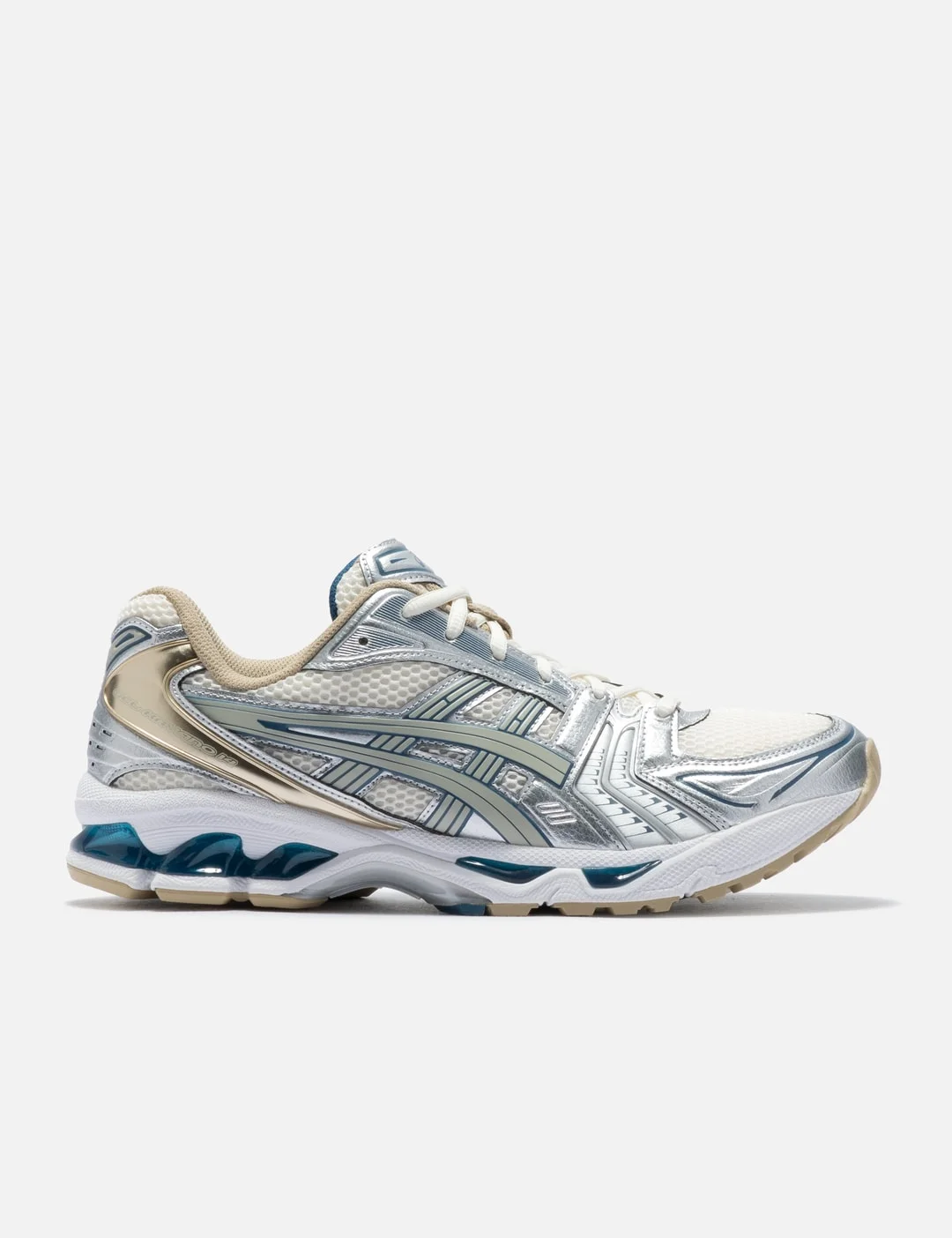 - Asics - GEL-Kayano 14 - Mesh, leather, and synthetic upper - Lace-up closure - GEL technology cushioning - Trusstic System - Rubber outsole - Color: Cream/ Pure Silver - Material: Mesh, Synthetic, Rubber - See more Sneakers and Shoes - Vendor Code: 1201A019-105