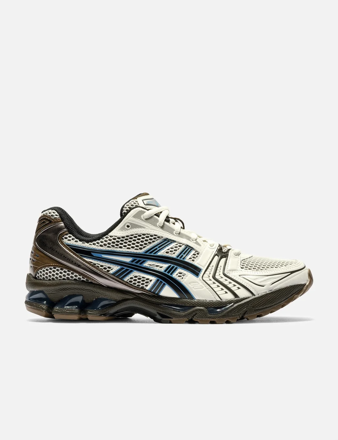 - Asics - Gel-Kayano 14 - Mesh upper with synthetic leather overlays - Lace-up closure - Branded tongue - GEL Cushioning technology - TRUSSTIC support system - Rubber outsole - Color: Cream/Blue Coast - Material: Synthetic, Textile, Rubber - See more Sneakers and Shoes - Vendor Code: 1203A740-104