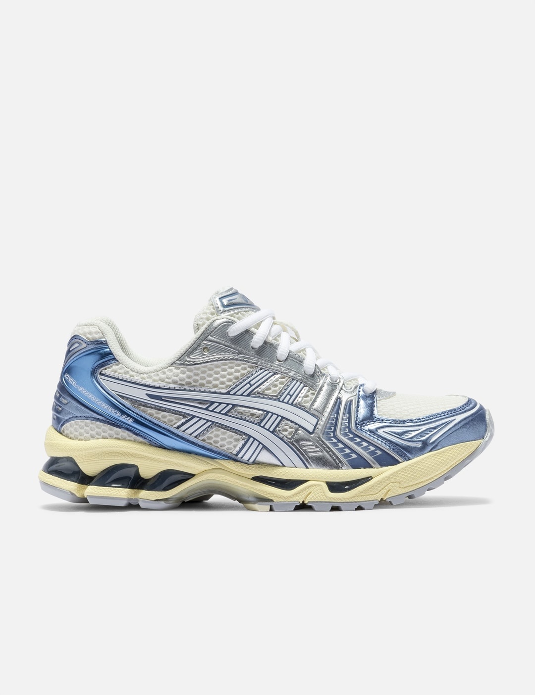 - Asics - Gel-Kayano 14 - Mesh, leather, and synthetic upper - Lace-up closure - GEL technology cushioning for excellent shock absorption - Trusstic System - Rubber outsole - Color: White/Waterfall - Material: Mesh, Leather, Synthetic, Rubber - See more Sneakers and Shoes