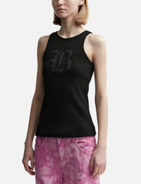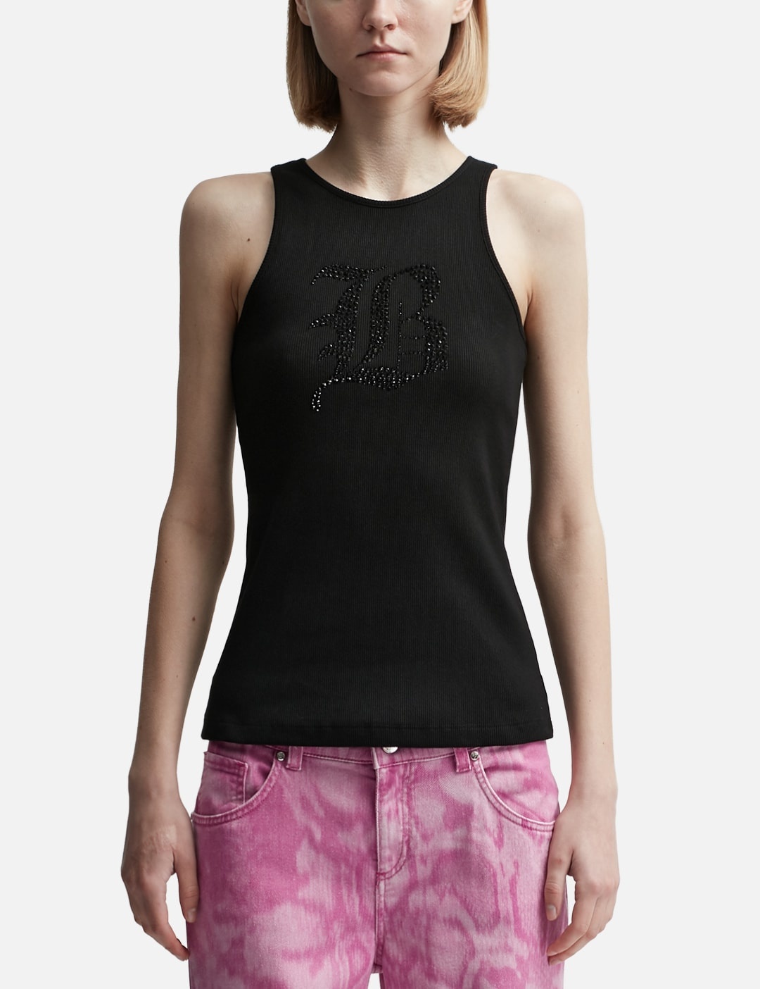 - Blumarine - B Logo Tank - Ribbed stretch cotton fabric - Tonal rhinestone embellished logo at front - Racer-back - Straight hem - Color: Black - Country Of Origin: IT - Material: 95% Cotton, 5% Elastane - See more Tanks and Clothing SIZING - Model wears size S - Model measures: Height 179cm, Chest 32”/81cm, Waist 23’’/58.42cm, Hip 35’’/88.9cm