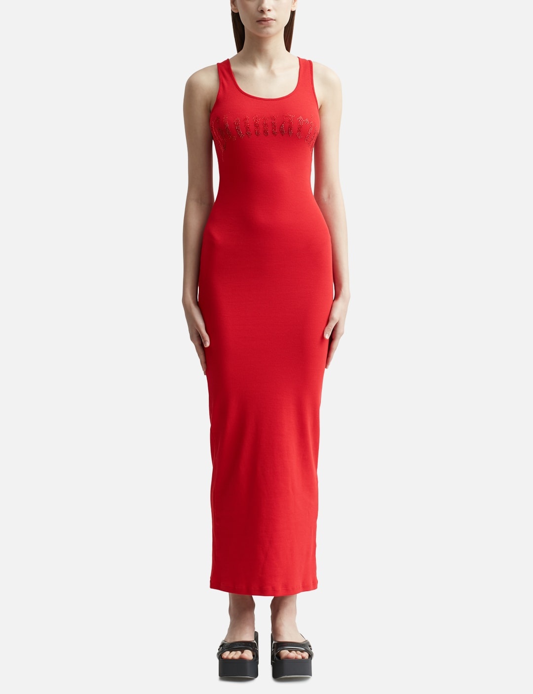 - Blumarine - Logo Long Dress - Slim fit - Sleeveless design - Scoop neck - Tonal applique branding to the chest - Racerback - Maxi length - Color: Lipstick Red - Country Of Origin: IT - Material: 95% Cotton, 5% Elastane - See more Dresses and Clothing SIZING - Model wears size XS - Model measures: Height 176cm, Chest 32”/81cm, Waist 23”/59cm,Hip 35”/90cm