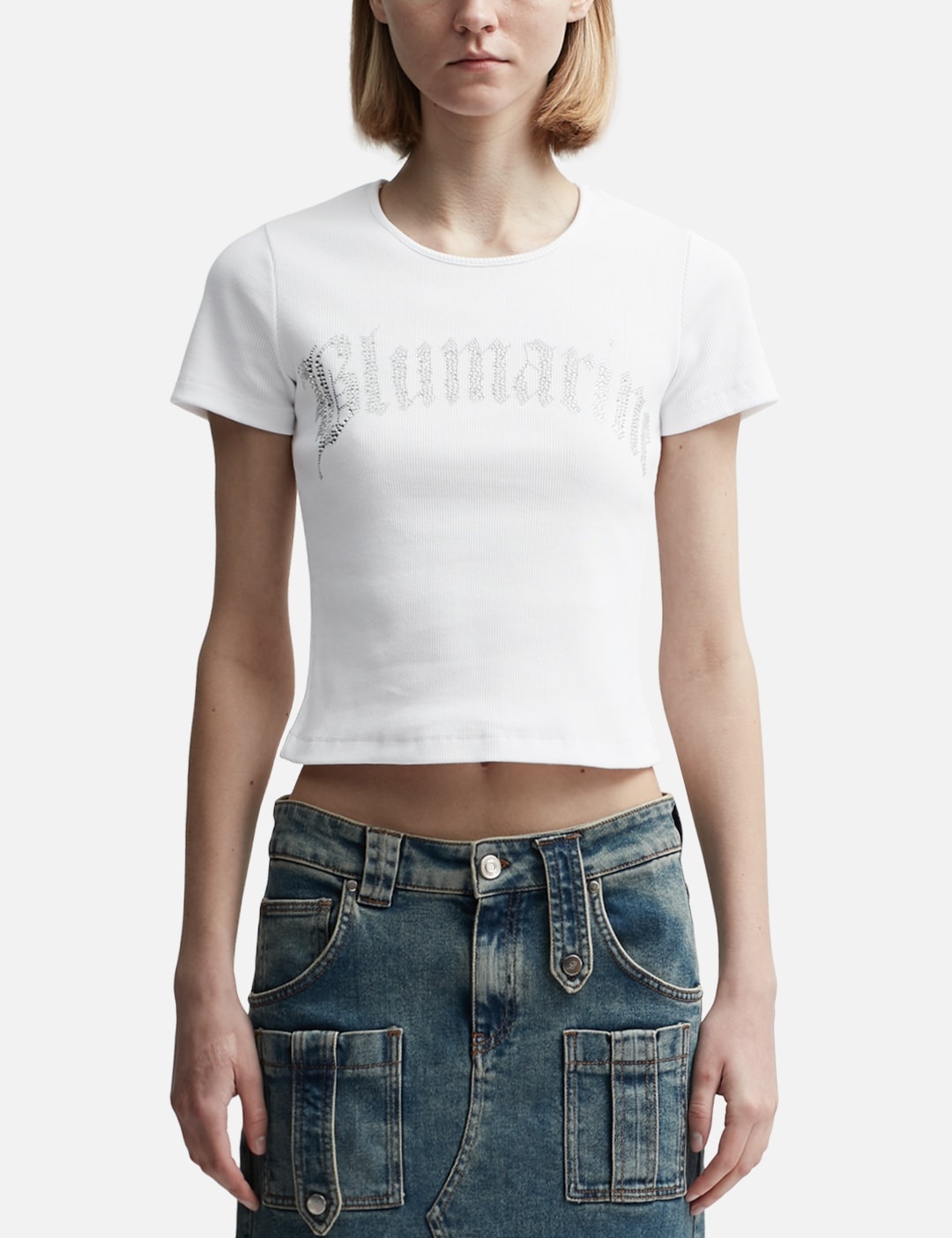 - Blumarine - Ribbed T-Shirt with Blumarine Logo in Rhinestones - Regular fit - Short sleeves - Cropped cut - Rib-knit construction - Crewneck - Blumarine logo rhinestone embellishment on front - Straight hem - Color: Optical White - Country Of Origin: IT - Material: 95% Cotton, 5% Elastane - See more SS T-Shirts, T-Shirts and Clothing SIZING - Model wears size S - Model measures: Height 179cm, Chest 32”/81cm, Waist 23’’/58.42cm, Hip 35’’/88.9cm