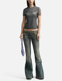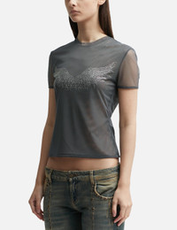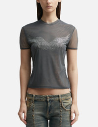 - Blumarine - Tulle Wing Front Top - Sheer construction - Regular fit - Crewneck - Short sleeves - Crystal-embellished wings motif on the front - Straight hem - Color: Black - Country Of Origin: IT - Material: 82% Nylon, 18% Elastane - See more Tops and Clothing SIZING - Model wears size 40 - Model measures: Height 179cm, Chest 33”/83cm, Waist 24.8”/63cm,Hip 35’’/89cm