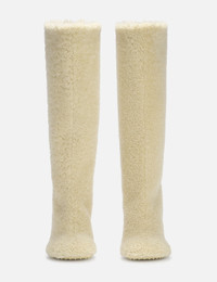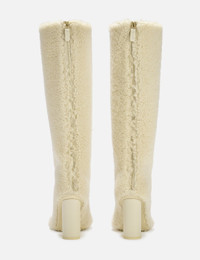 - Bottega Veneta - Atomic Boot - Shearling outer - Knee-high - Round toe - Rear zip closure - Cylindrical heel - Lambskin lining - Lugged bio-based rubber outsole - Heel height: 3.5"/9cm - Color: Beige - Material: 100% Lambskin - See more Boots and Shoes