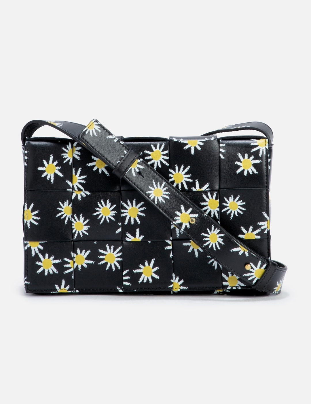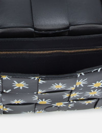 - Bottega Veneta - Daisy Print Cassette - Calfskin leather outer - Signature Intreccio construction - Flap cover with magnetic closure - Adjustable strap - Cross-body carry - All-over daisy motif - Brass hardware - Single main compartment - Interior zip pocket - Calfskin bonded Intreccio lining - Color: Black/White/Yellow - Material: Calfskin - See more Cross-Body Bags, Bags and Accessories SIZING Approximate dimensions: - Height: 13cm - Width: 22cm - Depth: 5cm - Strap Length: 52cm