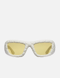 - Bottega Veneta - Intrecciato Rectangular Sunglasses - Bio nylon lenses - Intrecciato pattern on front - Intrecciato pattern on temples - Made in Japan - Color: White/Yellow - Material: Acetate - See more Sunglasses, Eyewear and Accessories SIZING Approximate dimensions: - Frame Height: 5cm - Frame Width: 14cm - 56 19 - 130