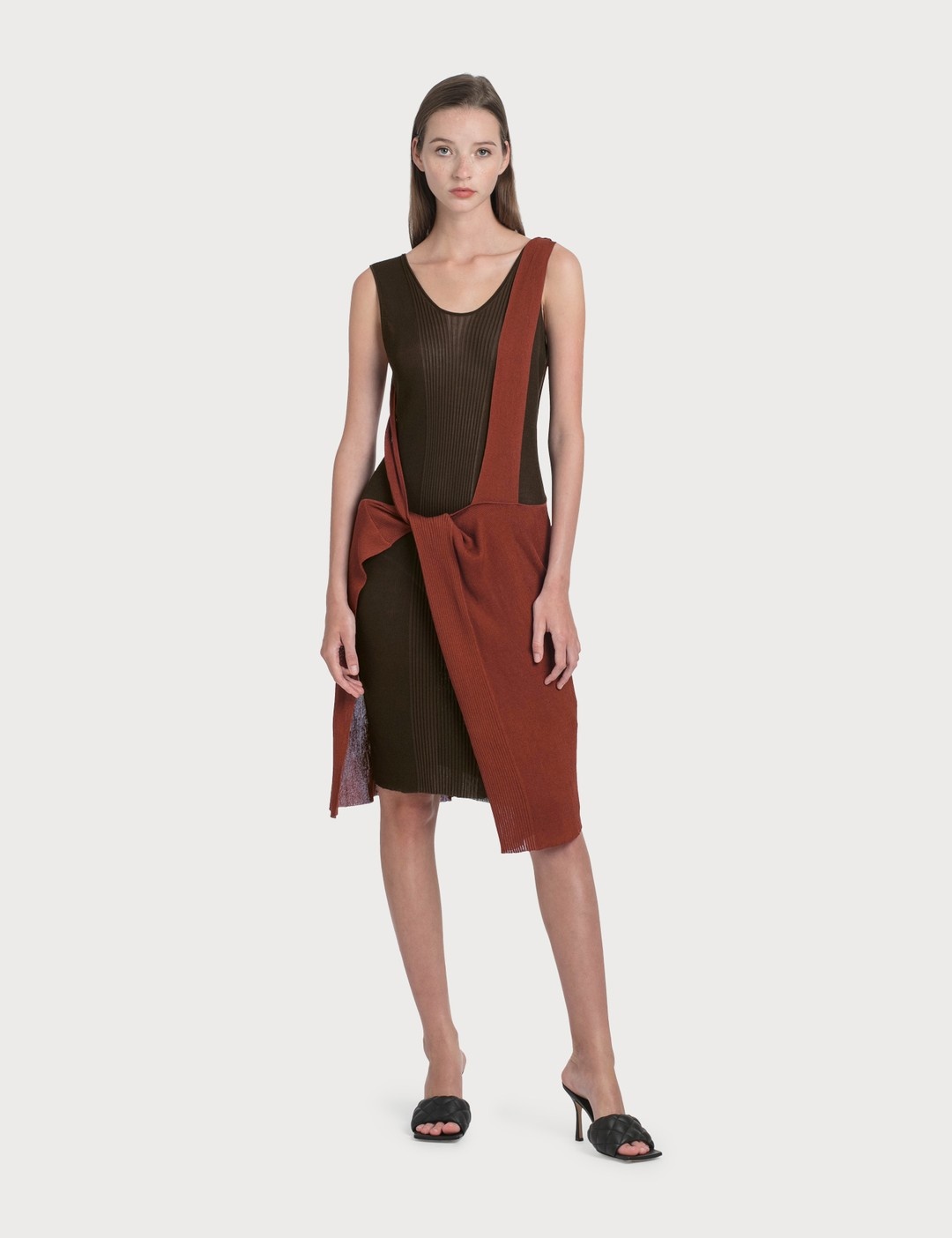 - Bottega Veneta - Knit Dress With Knock - Bi-color sheer silk ribbed knit dress - Deconstructed to look like two dresses loosely layered together - Sleeveless - Scoop neck - Color: Rust Chocolate - Material: 57% Cotton, 43% Silk - See more Dresses and Clothing SIZING - Model wears size 38 - Model measures: Height 177cm, Chest 30”/76cm, Waist 23”/59cm, Hip 35”/90cm
