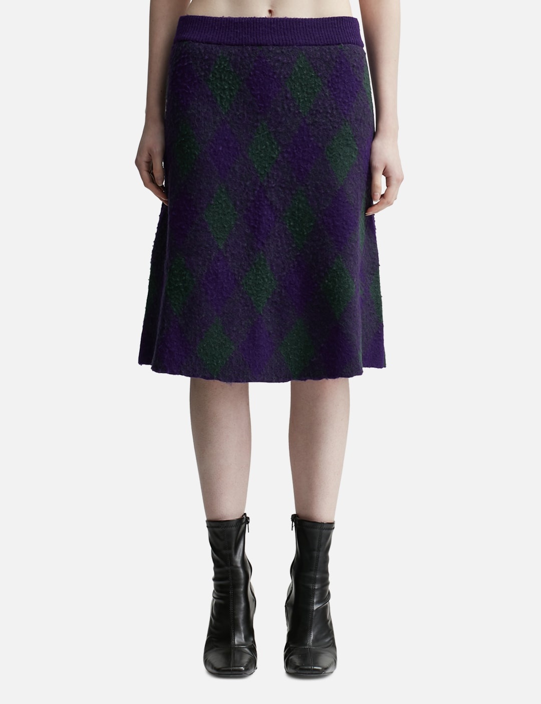 - Burberry - Argyle Wool Skirt - Jacquard-woven brushed wool - Elasticated rib-knit waistband - Equestrian Knight Design at the front - Color: Royal - Material: 100% Wool - See more Skirts and Clothing SIZING - Model wears size S - Model measures: Height 175cm, Chest 31”/79cm, Waist 24”/62cm,Hip 35’’/89cm