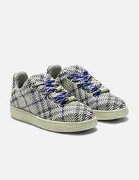 - Burberry - Check Knit Box Sneakers - Stretch nylon knitted with a check pattern upper - Mesh-lined - Lace-up closure - Barbed wire hardware at the laces - Burberry lettering at rubber outsole - Color: Lichen - Material: Upper: 98% Polyamide, 2% Elastane; Trim: 70% Polyester, 30% Brass; Lining: 63% Polyester, 23% Calf Leather, 7% Goat Suede, 7% Sheep Leather; Sole: 100% Thermoplastic Polyurethane - See more Sneakers and Shoes