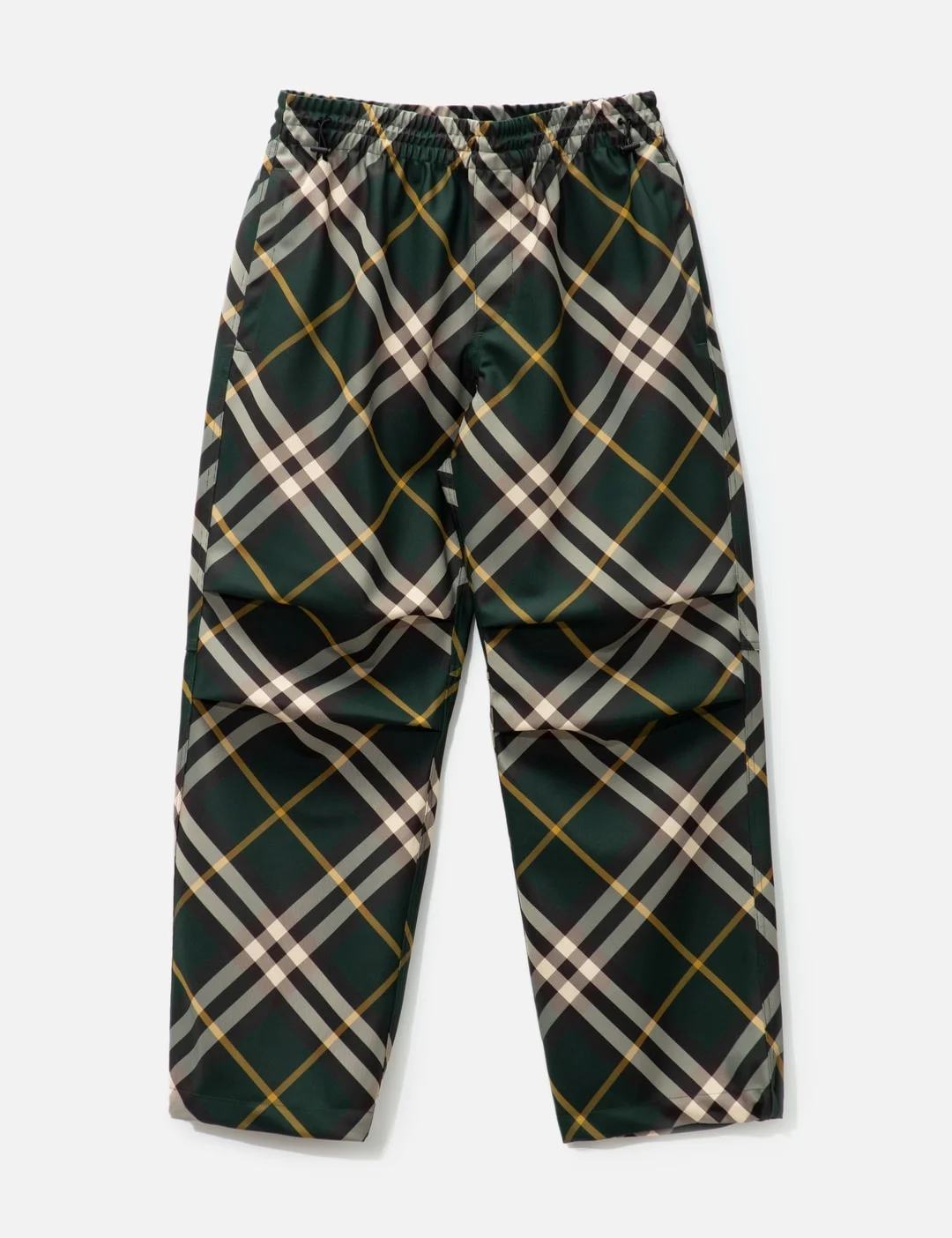 - Burberry - Check Pants - Relaxed fit - Lightweight twill fabric - Zip closure - Drawcord waist and cuffs - Side press-stud pockets - Printed Equestrian Knight Design at back flap pocket - Color: Ivy - Material: 100% Polyester - See more Pants and Clothing SIZING - Model wears size M - Model measures: Height 187cm, Chest 36”/91cm, Waist 29”/74cm, Hip 37”/94cm