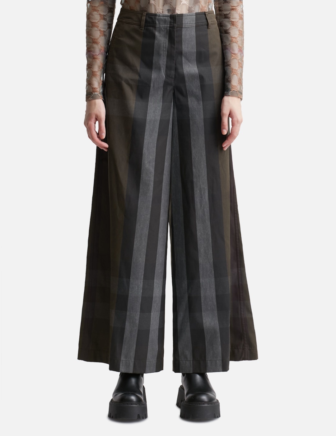 - Burberry - Checkered Trousers - Checked pattern throughout - Relaxed fit - Zip fly - Two welt side pockets - Two patch pockets at the rear - Branding embroidery on the rear pocket - Wide leg - Color: Dark Birch Brown Check - Material: 66% Polyester, 34% Cotton - See more Pants and Clothing
