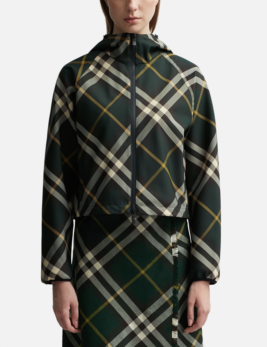 - Burberry - Cropped Check Lightweight Jacket - Lightweight jacket - Burberry check twill - Drawcord hood - Relaxed fit - Cropped hem - 2-way zip closure - Adjustable hem - Side zip pockets - Appliquéd equestrian knight design at side - Color: Ivy - Material: Outer: 100% Polyester; Trim: 100% Polyester; Inner: 100% Polyamide - See more Jackets and Clothing SIZING - Model wears size S - Model measures: Height 181cm, Chest 33”/84cm, Waist 24”/61cm, Hip 35”/90cm
