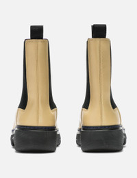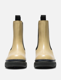 - Burberry - Leather Creeper Chelsea Boots - Smooth calf leather - Rounded toe - Elastic sides - Check insole - Pull tabs - Chunky rubber soles molded with archive Burberry lettering - Made in Italy - Color: Custard - Material: Upper: 50% Calf Leather, 40% Polyester, 10% Elastane; Lining: 70% Calf Leather, 30% Cotton; Sole: 100% Thermoplastic Polyurethane - See more Boots and Shoes
