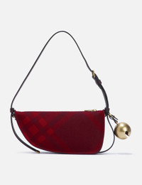 - Burberry - Mini Shield Sling Bag - Made of wool blend, jacquard-woven with check pattern - Folded shield shape - Detachable bell charm - Adjustable leather shoulder strap - Zip closure - Hand-painted edges - Brushed metal hardware - Nappa leather lining - Made in Italy - Color: Ripple - Material: Outer: 66% Polyester, 34% Wool; Trim: 100% Calf Leather; Lining: 100% Lambskin - See more Shoulder Bags, Bags and Accessories SIZING Approximate dimensions: - Height: 11cm - Width: 24cm - Depth: 4cm - Strap Length: 21cm