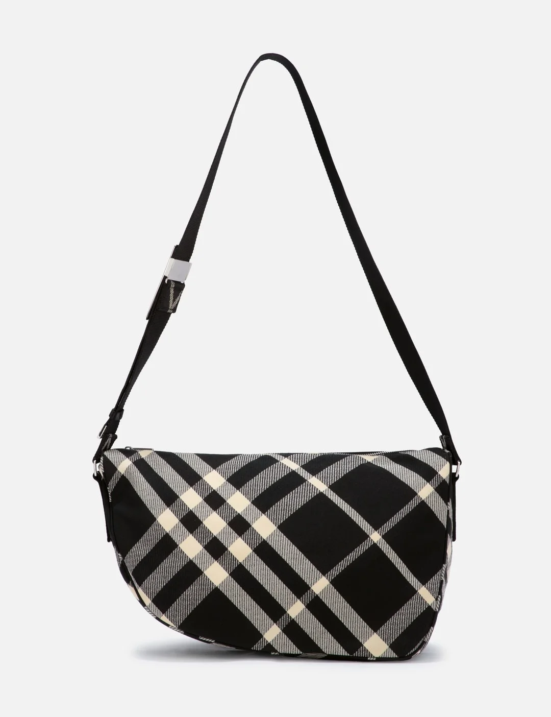 - Burberry - ML Shield Messenger Large - Jacquard - Burberry check pattern - Signature Equestrian Knight motif - Logo-engraved silver-tone hardware - Internal logo patch - Top zip fastening - Adjustable shoulder strap - Rear zip-fastening compartment - Main compartment - Diamond-quilted logo-jacquard lining - Color: Black - Material: 65% Polyester, 35% Cotton - See more Cross-Body Bags, Bags and Accessories SIZING Approximate dimensions: - Height: 27cm - Width: 41cm - Depth: 17cm - Strap Length: 46cm