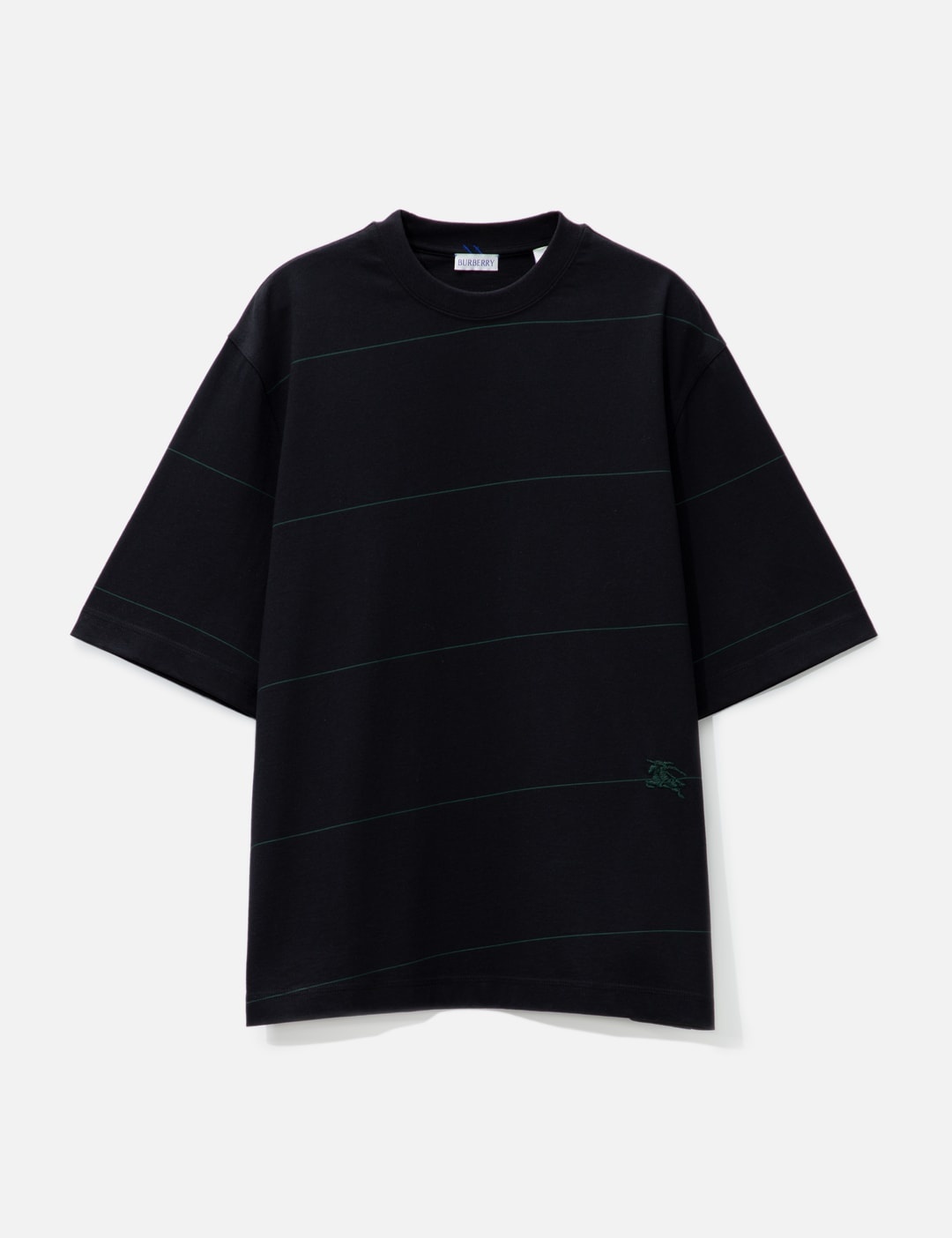 - Burberry - Striped Cotton T-Shirt - Regular fit - Short sleeves - Ribbed crewneck - Screen-printed stripes - Equestrian Knight Design embroidery on front - Straight hem - Color: Black - Material: 100% Cotton - See more SS T-Shirts, T-Shirts and Clothing SIZING - Model wears size M - Model measures: Height 187cm, Chest 36”/91cm, Waist 29”/74cm, Hip 37”/94cm