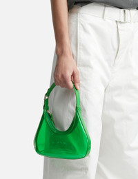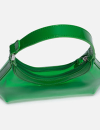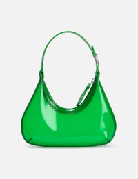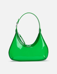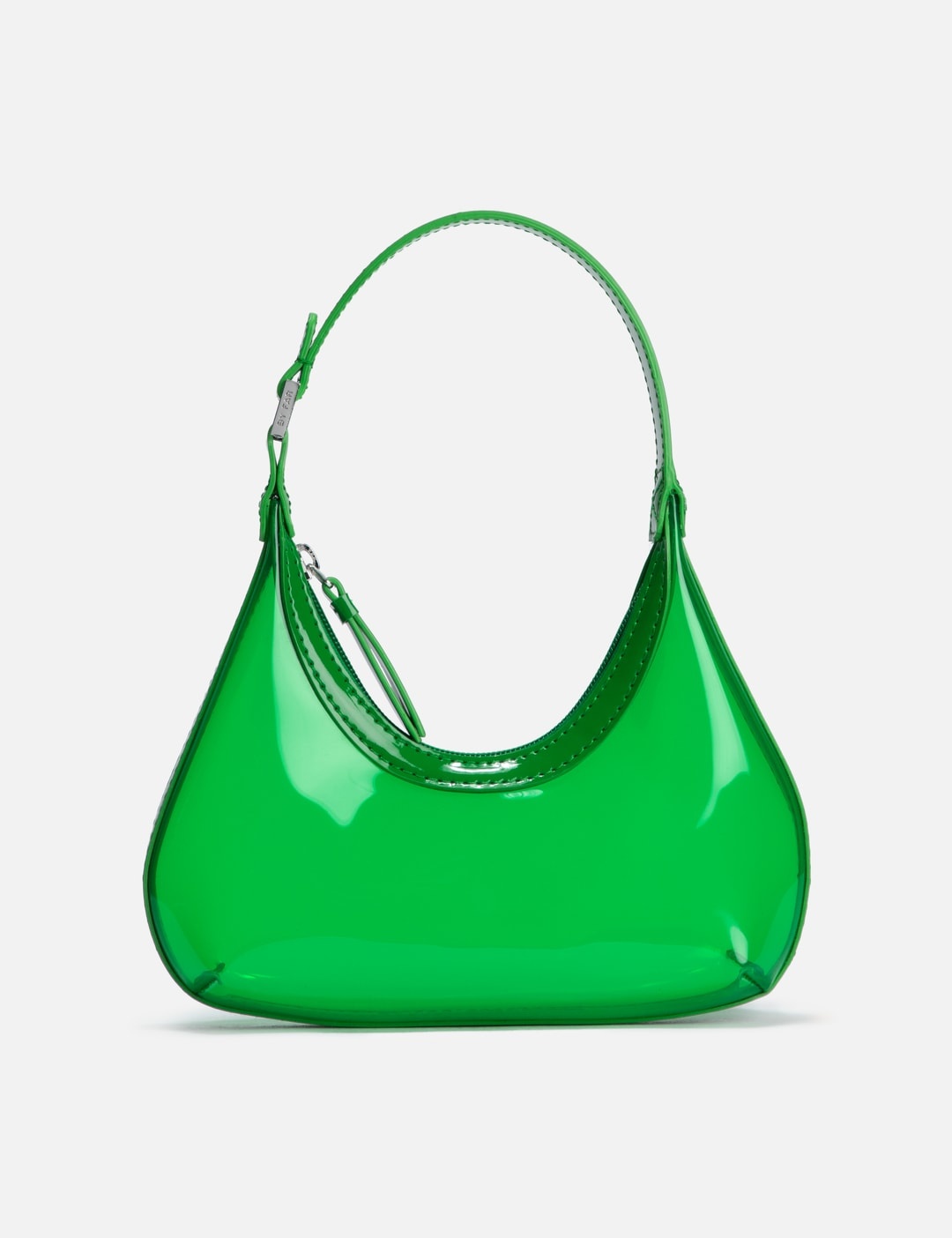 - BY FAR - Baby Amber - Transparent PVC exterior - Structured silhouette with sleek, curved lines - Top zip fastening - PU handle with logo-engraved buckle - Silver-tone hardware - Color: Clover Green - Material: 100% OEKO-TEX® Certified Eco PVC, 100% PU - See more Bags and Accessories SIZING Approximate dimensions: - Height: 9cm - Width: 24cm - Depth: 5.5cm - Strap Length: 18cm