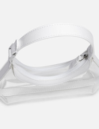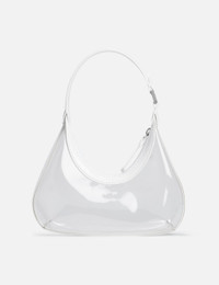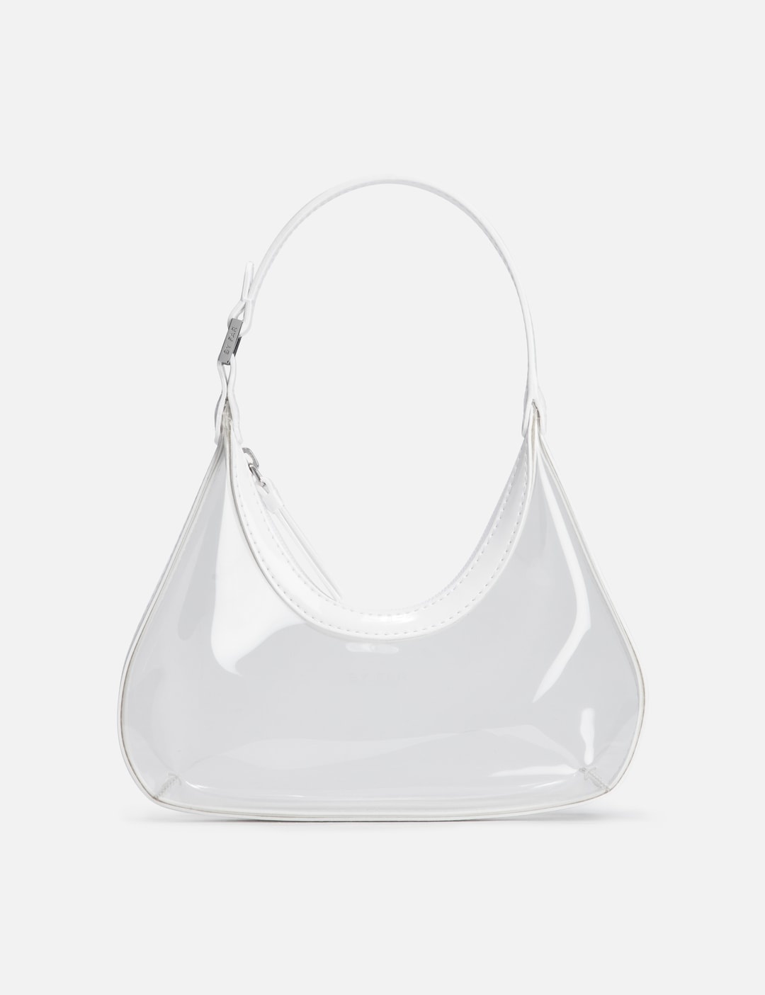 - BY FAR - Baby Amber - Structured silhouette with sleek, curved lines - Transparent profile constructed with recycled pre-consumer PU - PU handle with logo-engraved buckle - Top zip fastening - Silver-tone hardware - Color: Transparent White - Material: PU, Recycled PU - See more Bags and Accessories SIZING Approximate dimensions: - Height: 9cm - Width: 24cm - Depth: 5.5cm - Strap Length: 18cm