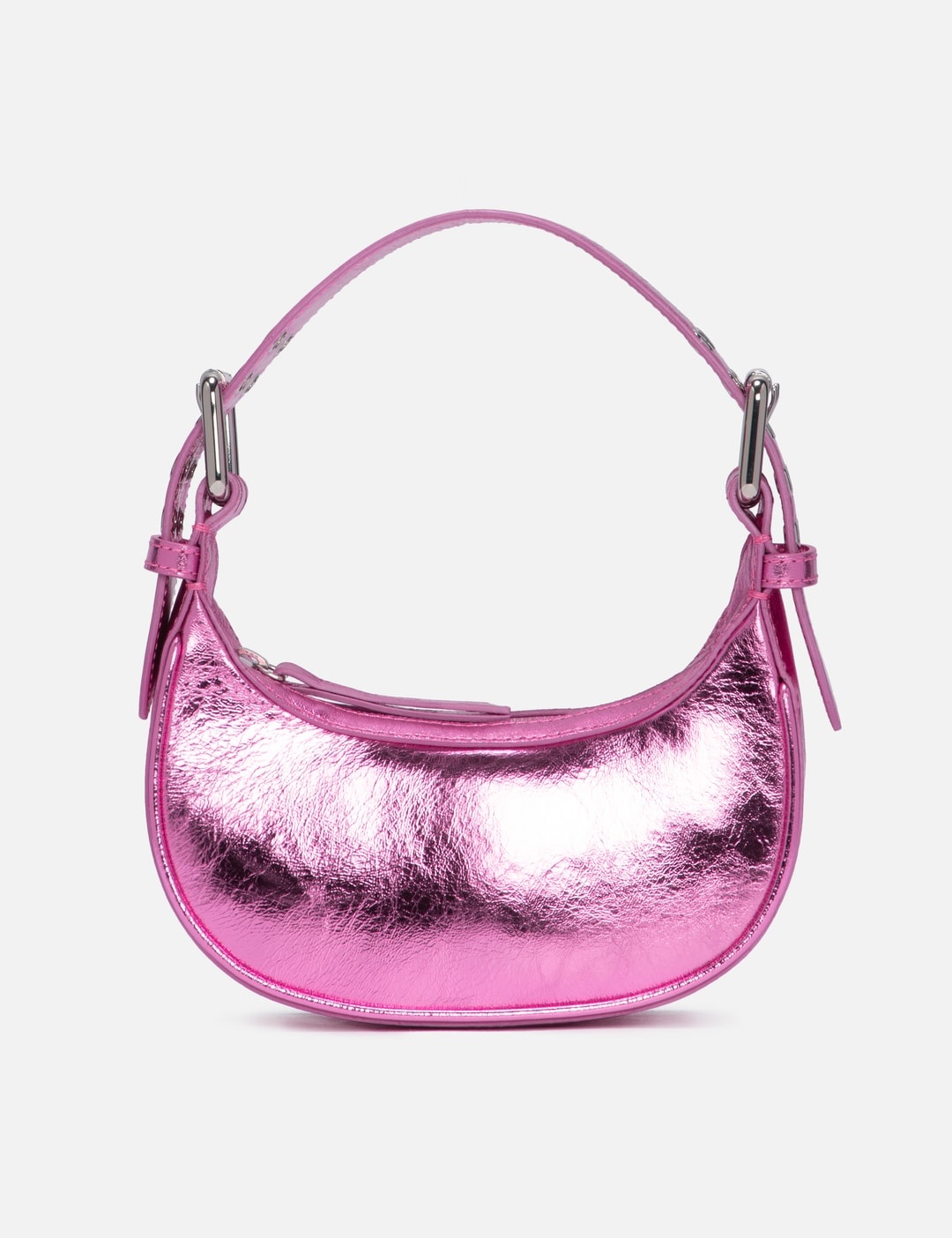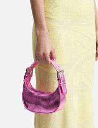 - BY FAR - Metallic Mini Soho - Italian lambskin exterior with a metallic finish - Curved silhouette - Adjustable leather handle - Zip closure - Oversized double-progued buckle and eyelet detailing - Cotton lining - Silver-toned hardware - Fits an iPhone - Color: Lipstick - Material: 100% Lambskin - See more Bags and Accessories SIZING Approximate dimensions: - Height: 8cm - Width: 18cm - Depth: 6cm - Handle Length: 16cm
