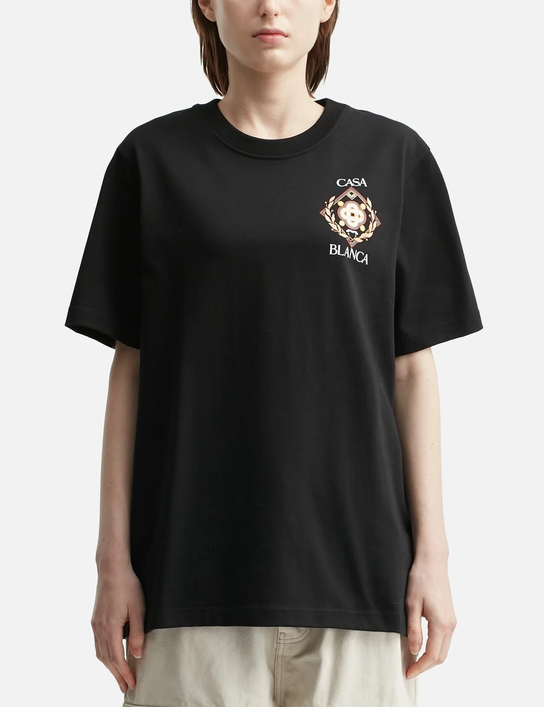 - Casablanca - Championship Diamond T-shirt - Made of organic cotton - Ribbed crewneck - Short sleeve - Championship diamond graphic at chest and back - Made in Portugal - Color: Black - Material: 100% Organic Cotton - See more SS T-Shirts, T-Shirts and Clothing - Model wears size M - Model measures: Height 186cm, Chest 34”/86cm, Waist 28”/71cm, Hip 36”/91cm - Vendor Code: MPF25-JTS-001-12-EX