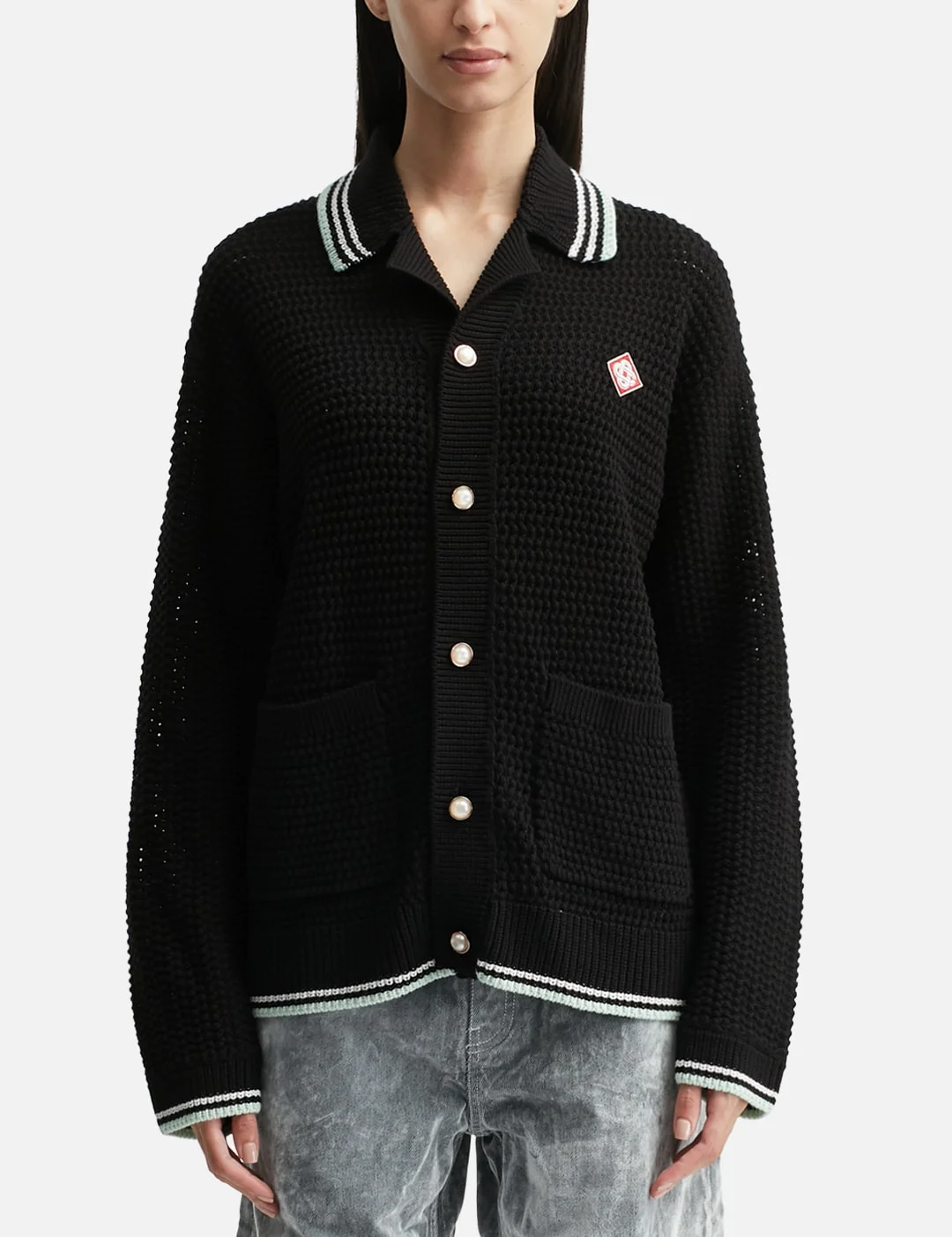 - Casablanca - Embroidered Cotton Crochet Long Sleeve Shirt - Made of crochet cotton fabric - Relaxed fit - Long sleeves - Ribbing and striped details on collar, cuffs and hem - Button closure - Signature logo on the chest - Front patch pockets - Branded lettering at back - Color: Black - Material: 100% Cotton - See more Knitwear and Clothing - Model wears size M - Model measures: Height 186cm, Chest 34”/86cm, Waist 28”/71cm, Hip 36”/91cm - Model wearing size S - Model measures: Height 179cm, Chest 32’’/ 81.3cm, Waist 24.5”’/62cm, Hip 34.5’’/88cm - Vendor Code: M-AW25-KW-1160-01