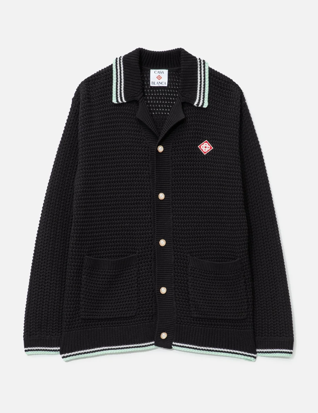 - Casablanca - Embroidered Cotton Crochet Long Sleeve Shirt - Made of crochet cotton fabric - Relaxed fit - Long sleeves - Ribbing and striped details on collar, cuffs and hem - Button closure - Signature logo on the chest - Front patch pockets - Branded lettering at back - Color: Black - Material: 100% Cotton - See more Knitwear and Clothing - Model wears size M - Model measures: Height 186cm, Chest 34”/86cm, Waist 28”/71cm, Hip 36”/91cm - Model wearing size S - Model measures: Height 179cm, Chest 32’’/ 81.3cm, Waist 24.5”’/62cm, Hip 34.5’’/88cm - Vendor Code: M-AW25-KW-1160-01