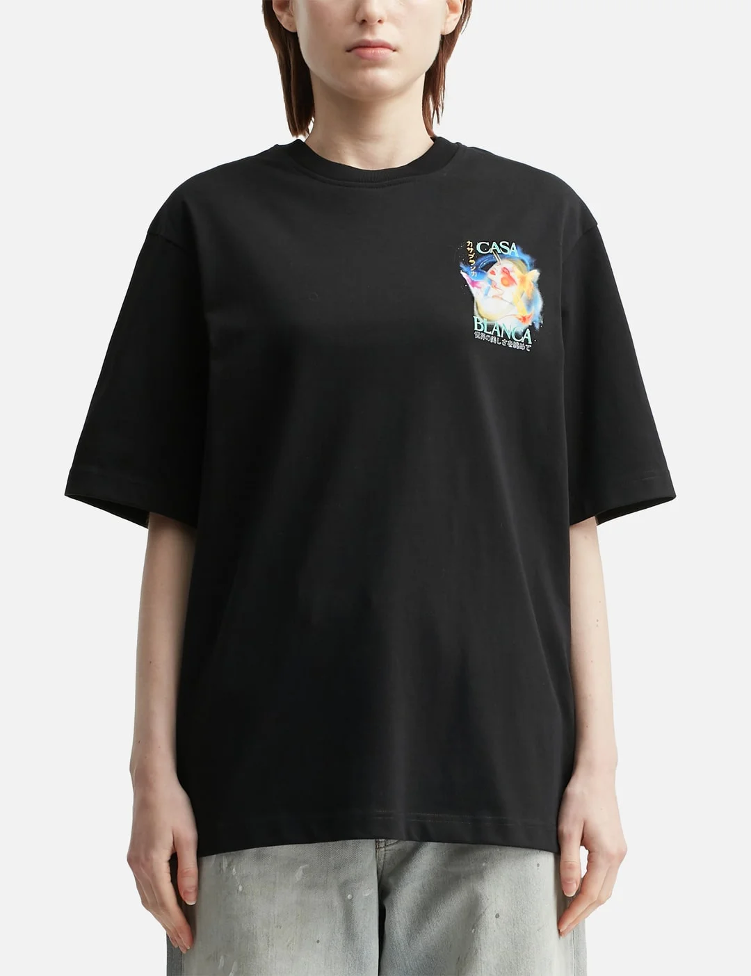 - Casablanca - Galactic Connection T-Shirt - Made of organic cotton - Oversized fit - Ribbed crewneck - Short sleeve - Airbrush artwork inspired by Pater Sato printed at chest and back - Made in Portugal - Color: Black - Material: 100% Organic Cotton - See more SS T-Shirts, T-Shirts and Clothing - Model wears size M - Model measures: Height 186cm, Chest 34”/86cm, Waist 28”/71cm, Hip 36”/91cm - Vendor Code: MPF25-JTS-044-05
